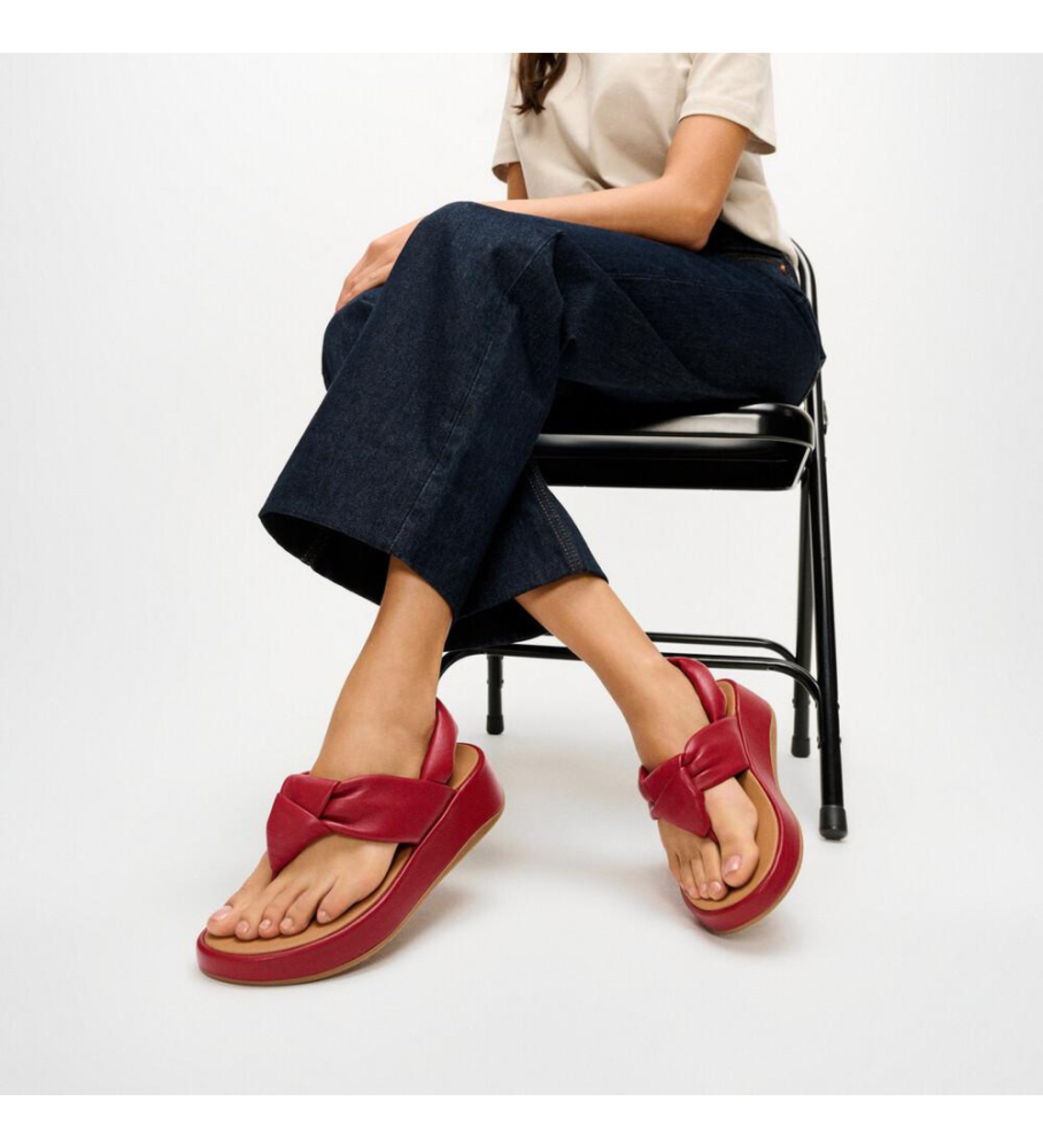 FitFlop's leather thong sandal turns the trend for cushioned volume into its most seductive hallmark. The straps intertwined in a central knot - generous, swollen and with a tactile softness that invites contact - create a sculptural architecture on the foot that makes this sandal more than just footwear: it is a statement of intent. The rounded, monochrome platform, which picks up the same tone as the upper, builds a pure, rounded block silhouette that projects confidence with every step.