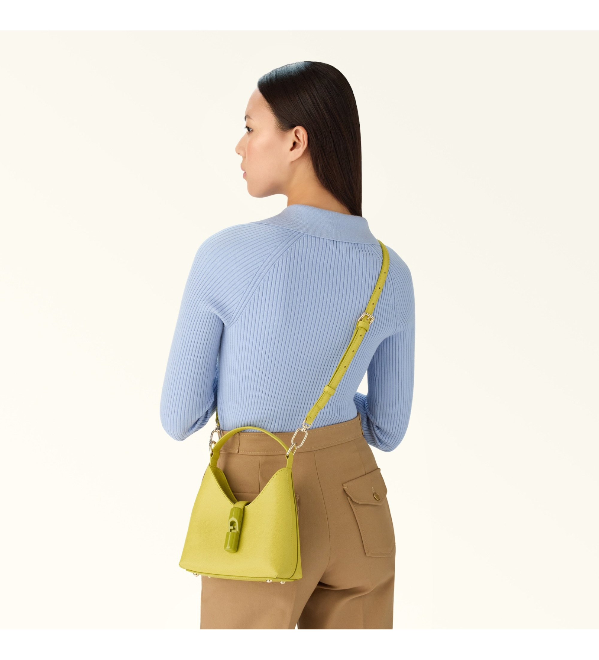 The Furla Iride mini hobo bag in printed leather features a smooth trapezoid shape. The matching handle is embellished with the brand's new cylindrical hardware and the iconic Furla Arco logo. Its compact open interior can hold all your essentials. Equipped with a removable adjustable-length shoulder strap, it can be carried in the hand or over the shoulder for added versatility.