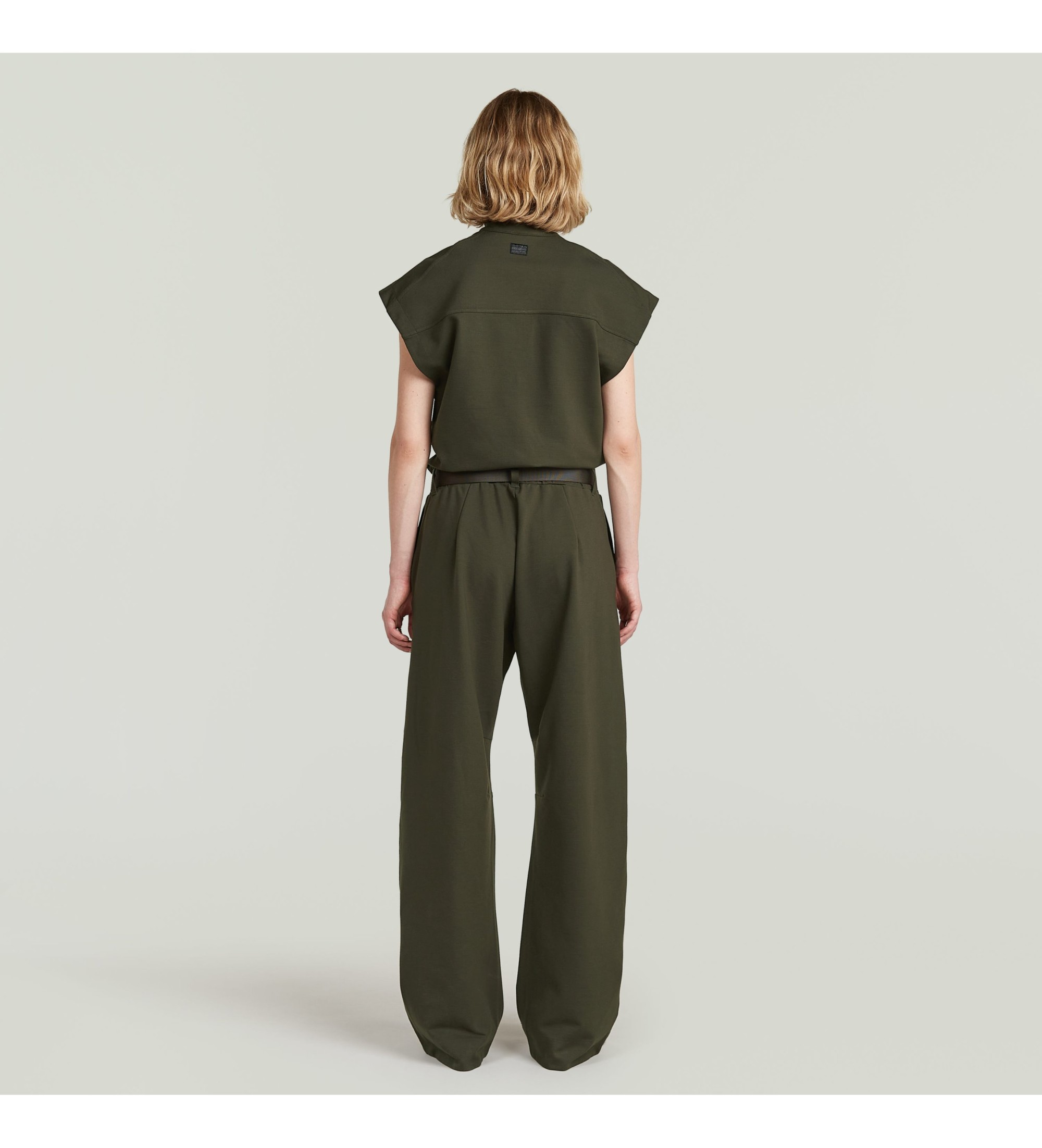 The jumpsuit offers a contemporary, utilitarian-inspired design with a front zip fastening. It is tailored for a comfortable, streamlined fit, ideal for a modern, functional look.