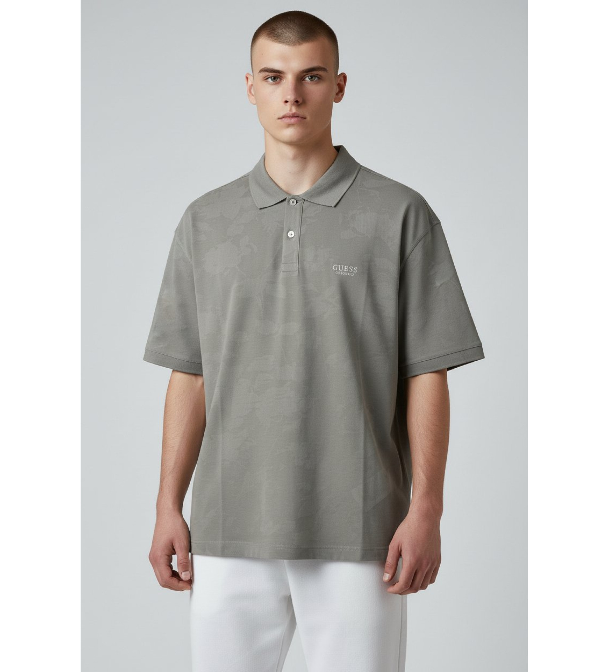 A polo shirt that balances classic and contemporary to perfection. Its tonal camouflage print in sage green adds depth and character without sacrificing sobriety, making it the ideal piece for a smart-casual look with personality. Signed by GUESS by Marciano, a guarantee of quality and signature design.