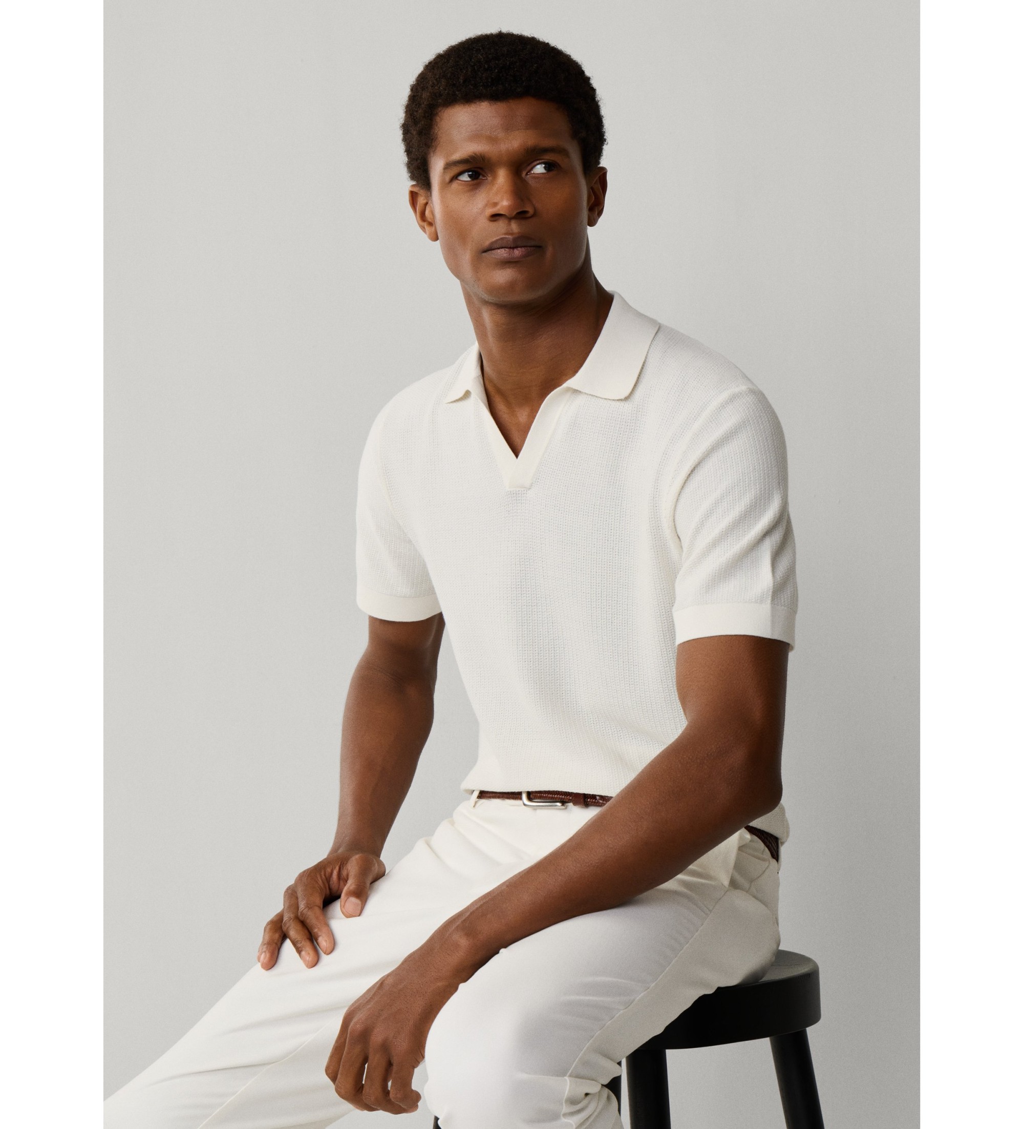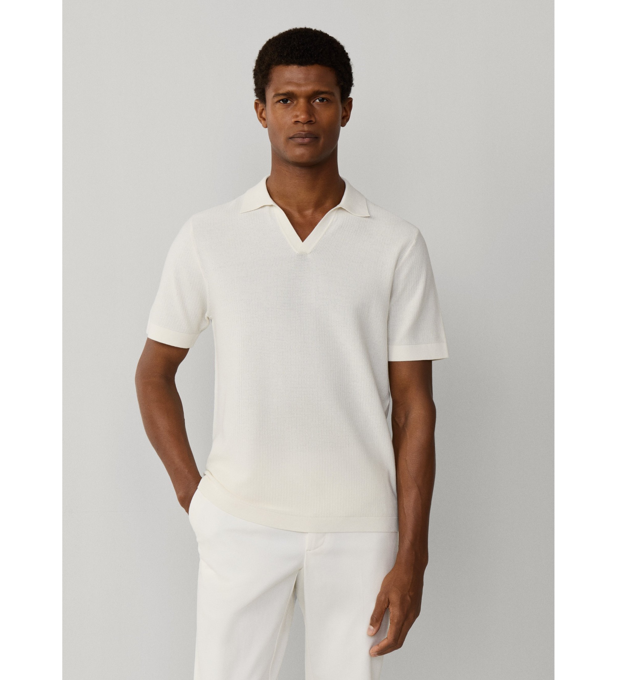 Regular fit knit men's polo shirt in white. With short sleeves and a distinctive 'Riviera' collar, it is fully fashioned and finished with a clean Milano stitch on the placket, collar and trims. Woven with a textured knit in 100% cotton yarn, it provides structure and a natural feel, ideal for neat, contemporary looks.