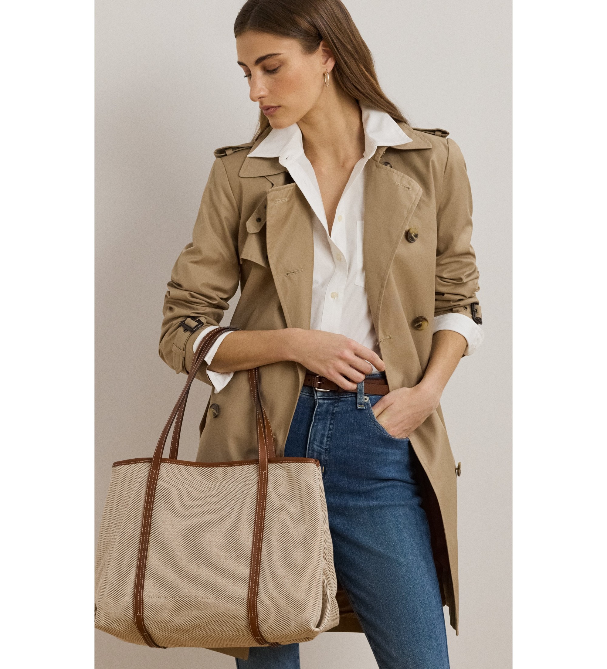 Lauren Ralph Lauren's large Emerie tote bag is crafted from a combination of durable cross-dyed canvas and supple full-grain leather, characterised by its natural smooth finish. It features a reversible design and a roomy silhouette perfect for storing your essentials. The ultimate bag for any occasion, whether it's a weekend getaway or running errands, it is complete with a supple leather bead with overlaid 'LRL' initials and an engraved metal plaque luggage tag for iconic Lauren style.