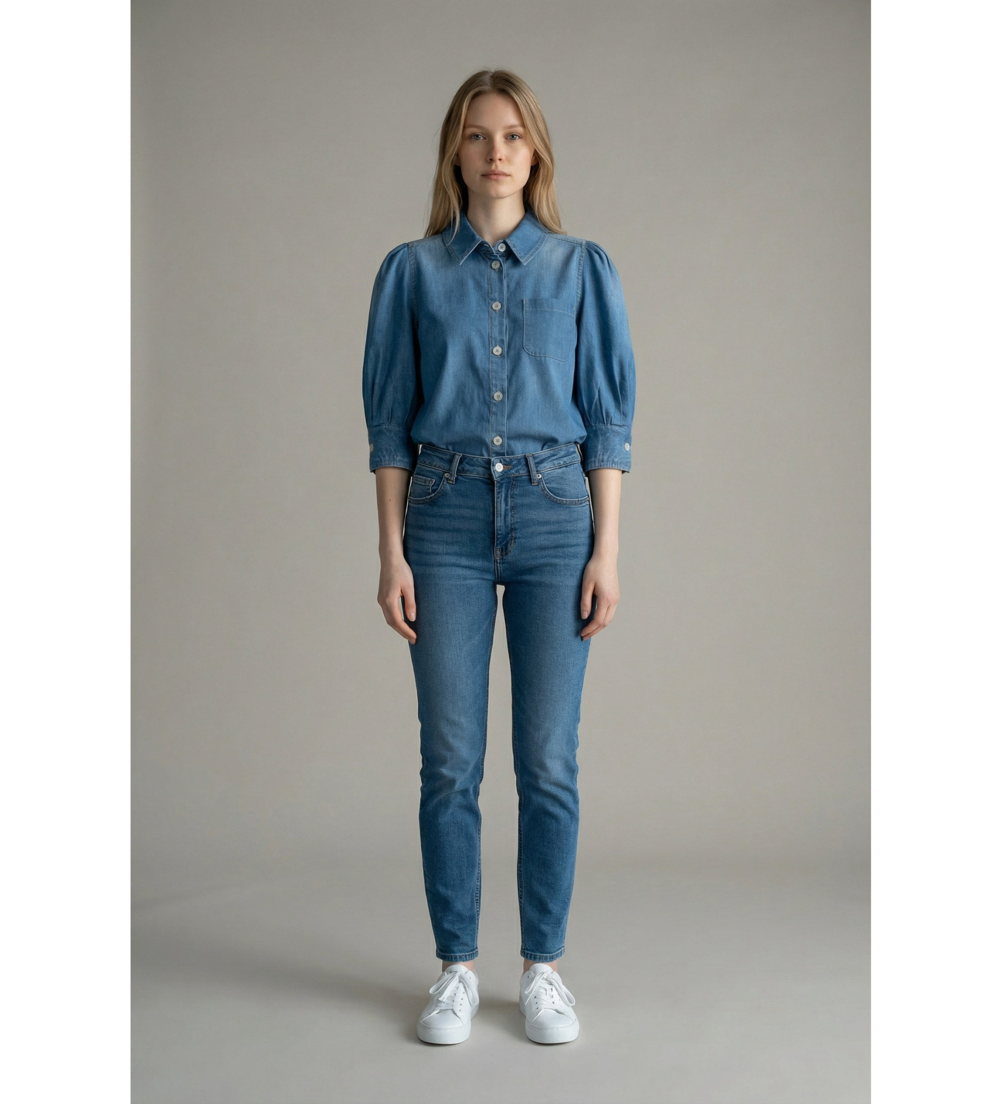Mid-blue denim chambray shirt from Marella with puffed sleeves and wide cuffs. A piece that elevates the classic denim effect with a romantic and sophisticated touch, perfect for pairing with tailored trousers, midi skirt or even over a dress for a more elaborate look.