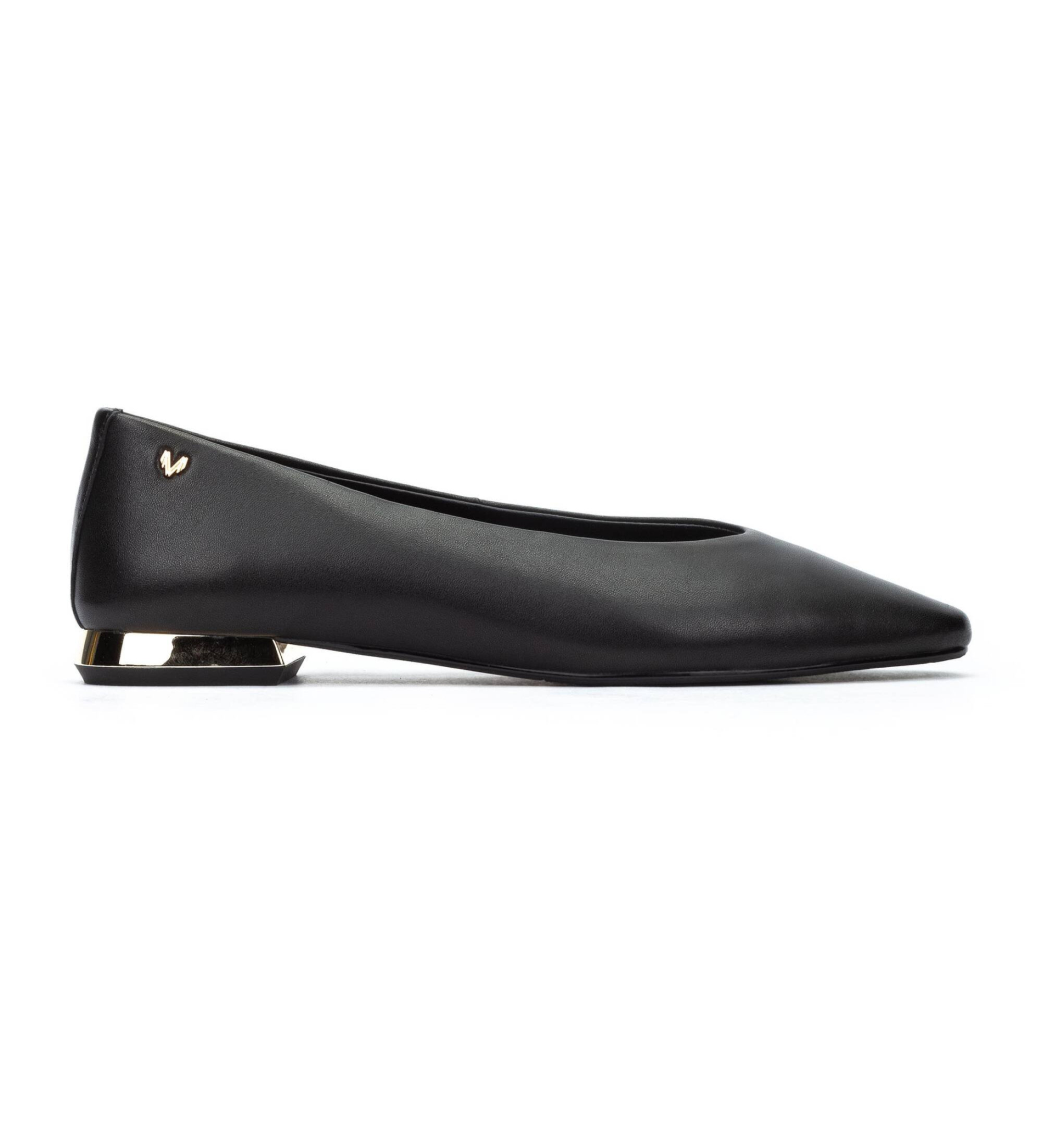Vescia ballerinas. Women's leather ballerinas with 2.3 cm metallic heel and almond toe. Squeeze every day with New Elegance, updated elegance and comfort.