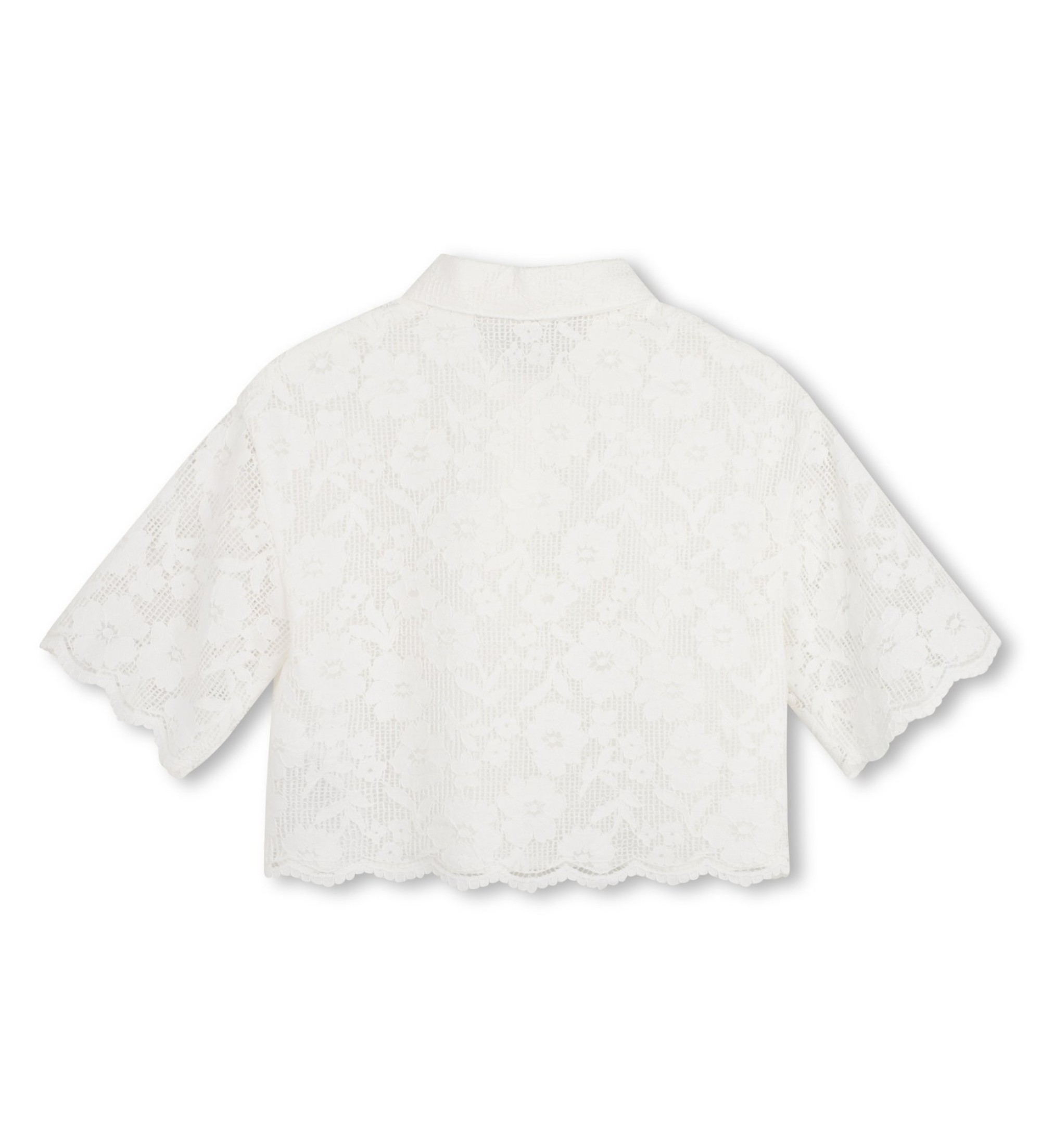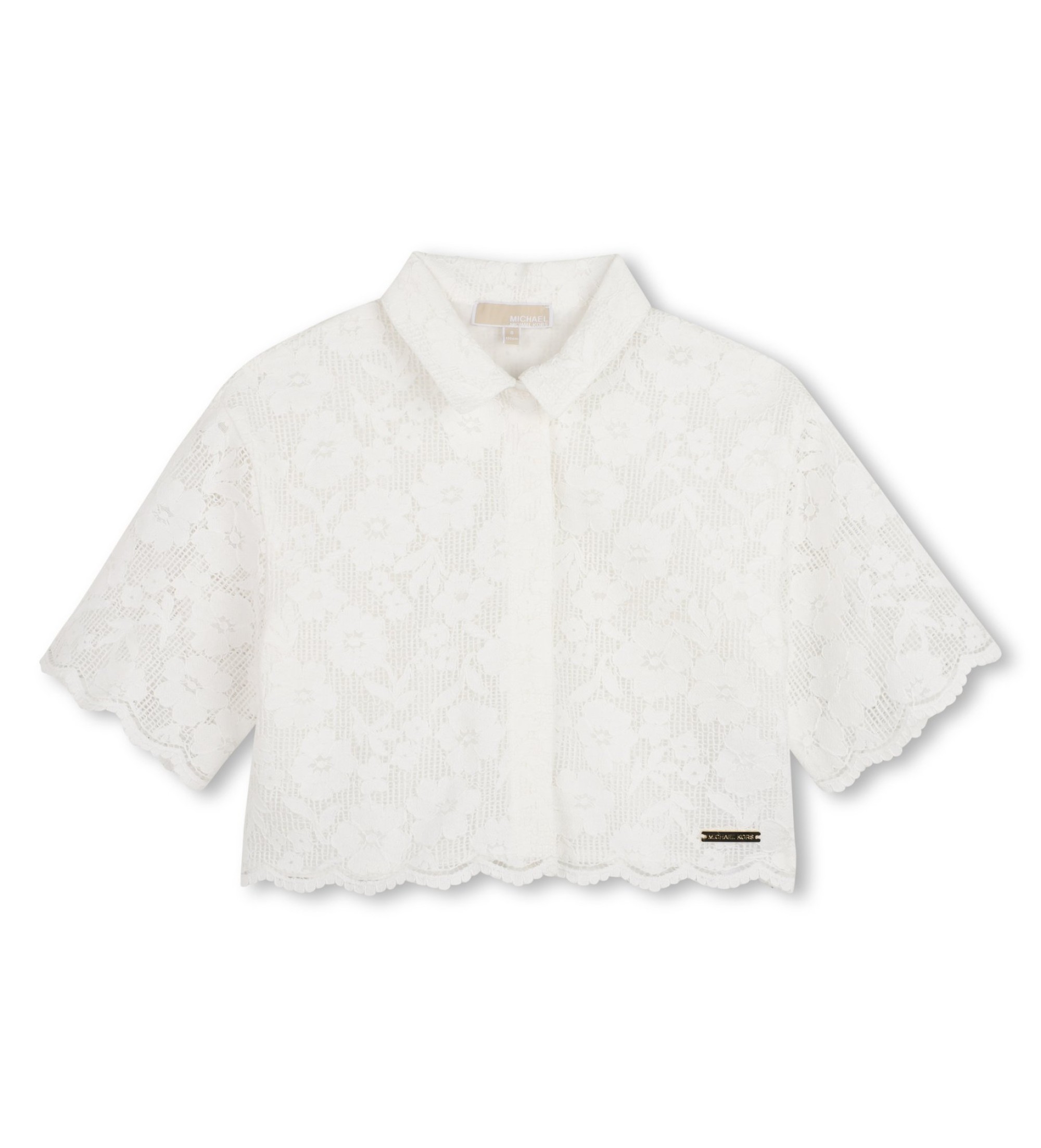 Short-sleeved guipure shirt with cotton percale lining and the brand's metallic badge. A sophisticated and feminine piece that combines the delicacy of guipure lace with a comfortable lining and an iconic metallic plaque for an elegant look with a lot of personality.