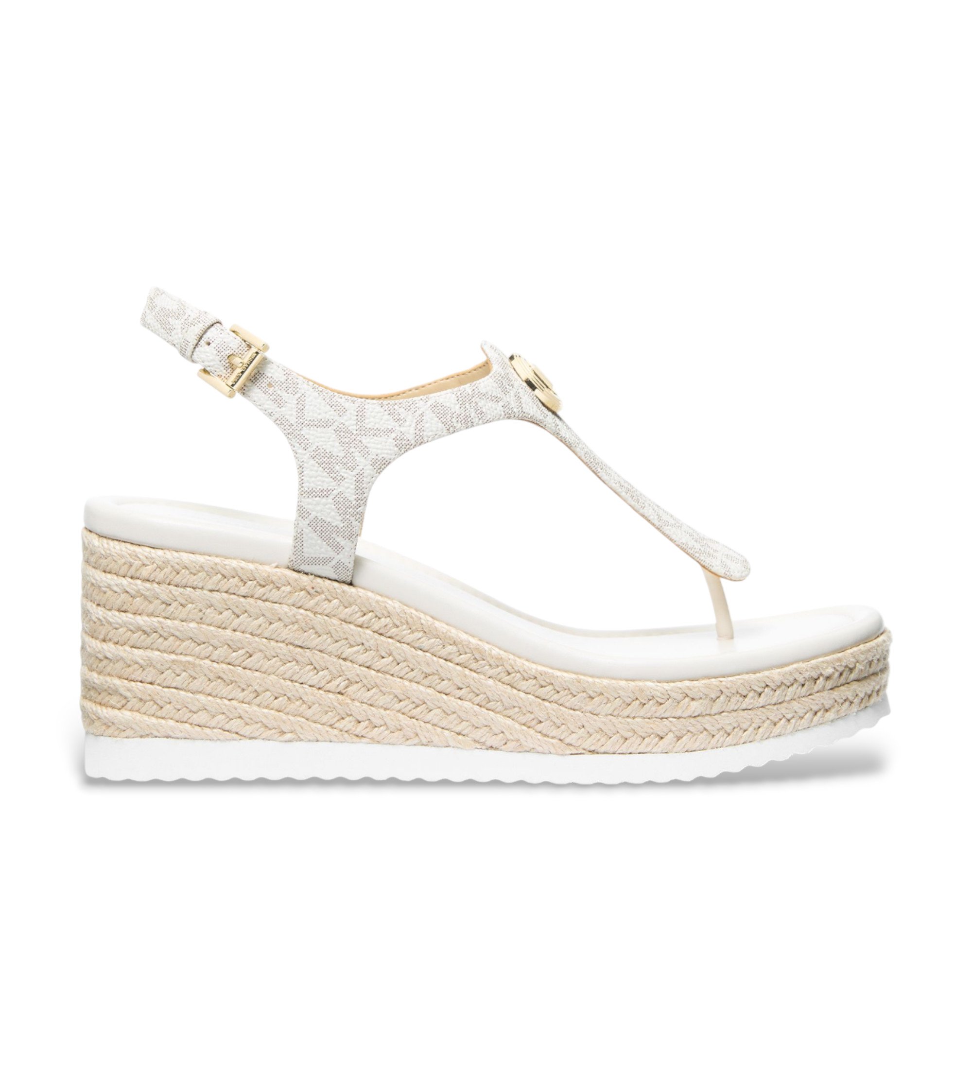 Wedge sandal designed to combine style and comfort for everyday wear. Featuring a sleek T-strap silhouette with distinctive metallic detailing on the instep and an adjustable ankle strap for a secure fit. The jute-lined wedge adds a natural, summery feel, while the platform balances the height for a stable stride. Ideal for elevating casual looks or accompanying more polished ensembles with a sophisticated touch.