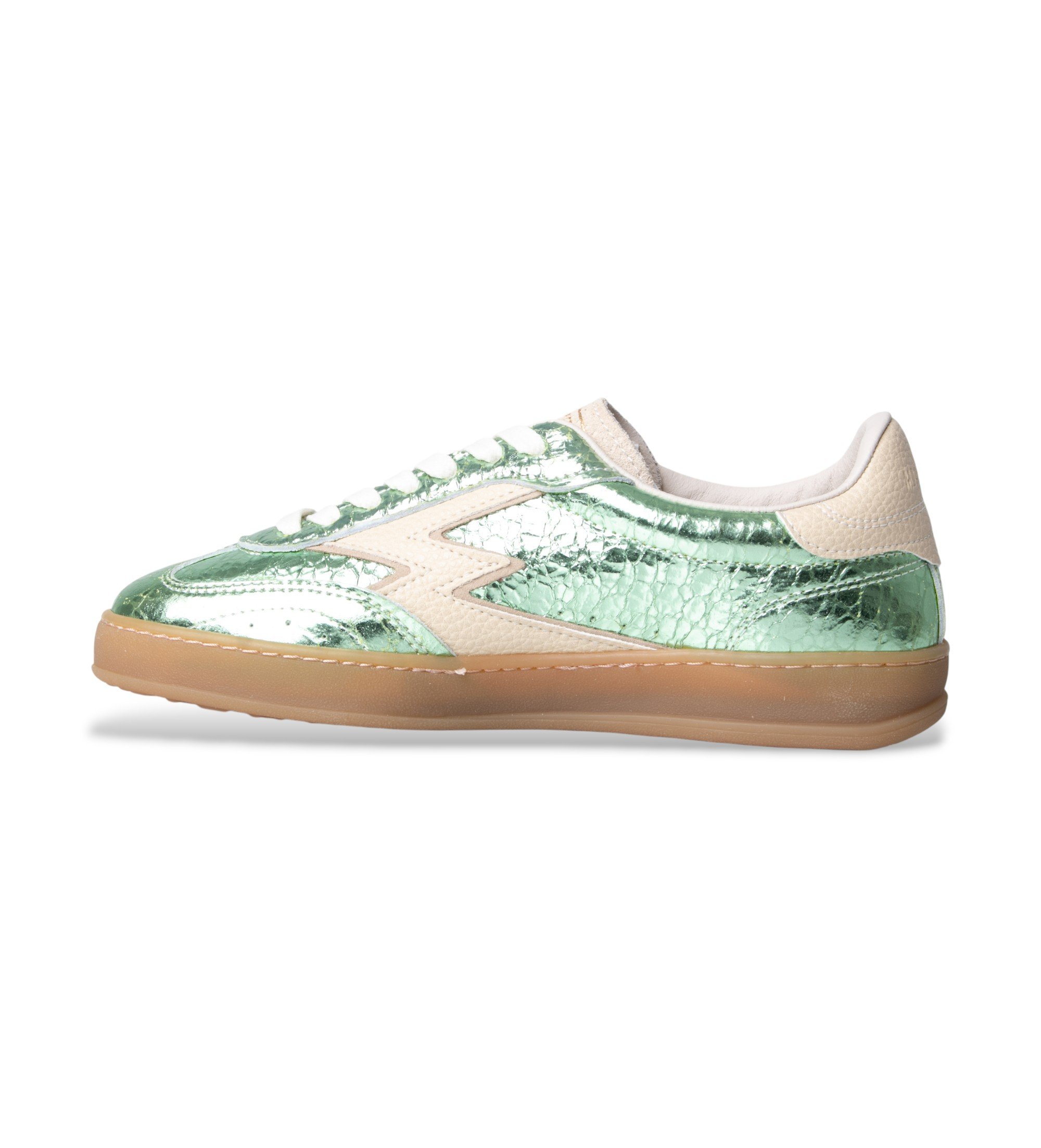 Low sneaker in mint green metallic leather with ecru details. A bold and luminous piece that combines the crackle finish of the metallic with the warmth of the natural rubber sole, resulting in a shoe with a lot of personality, perfect for elevating casual looks with a touch of originality and freshness.