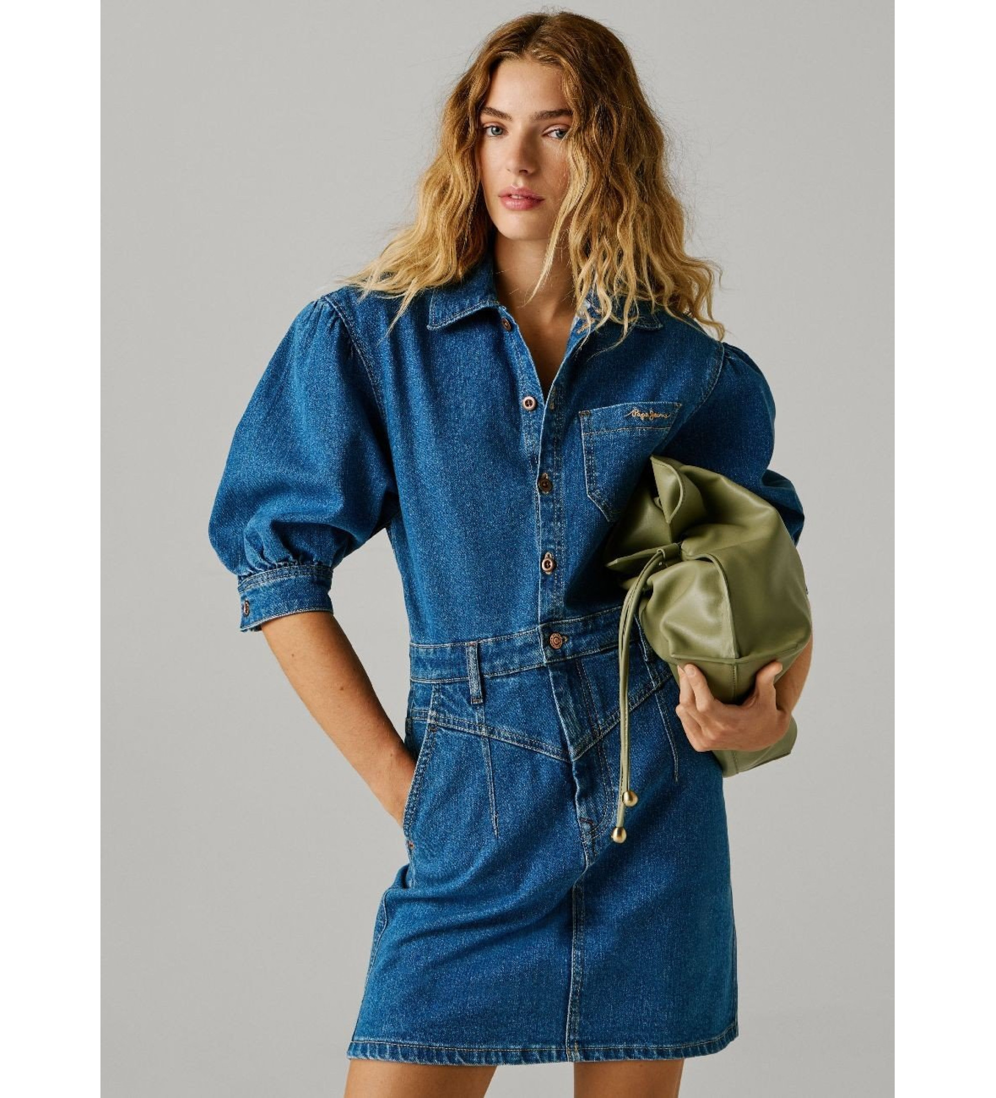 Denim dress with short puffed sleeves, comes in a comfortable mid-blue stretch denim.