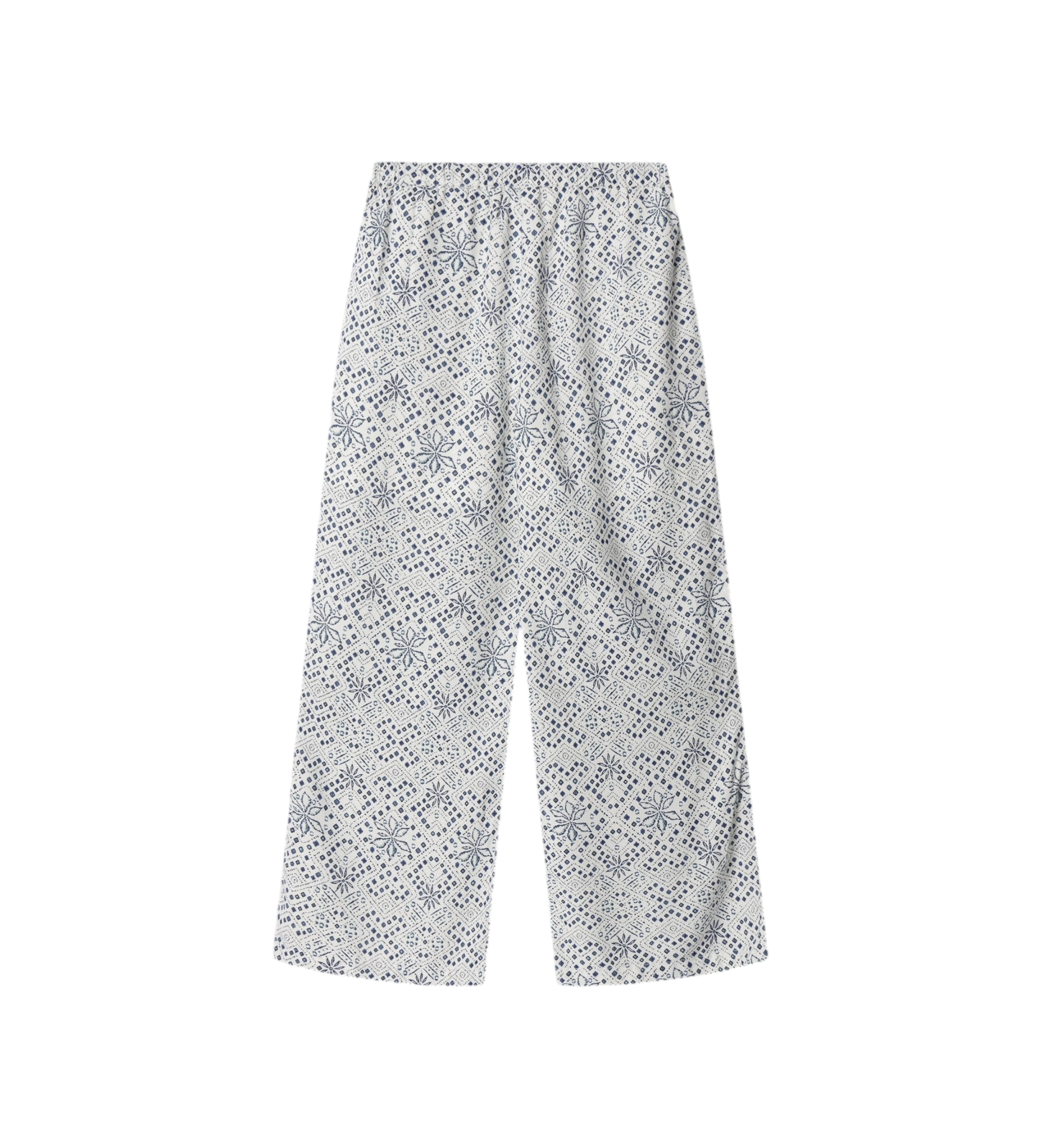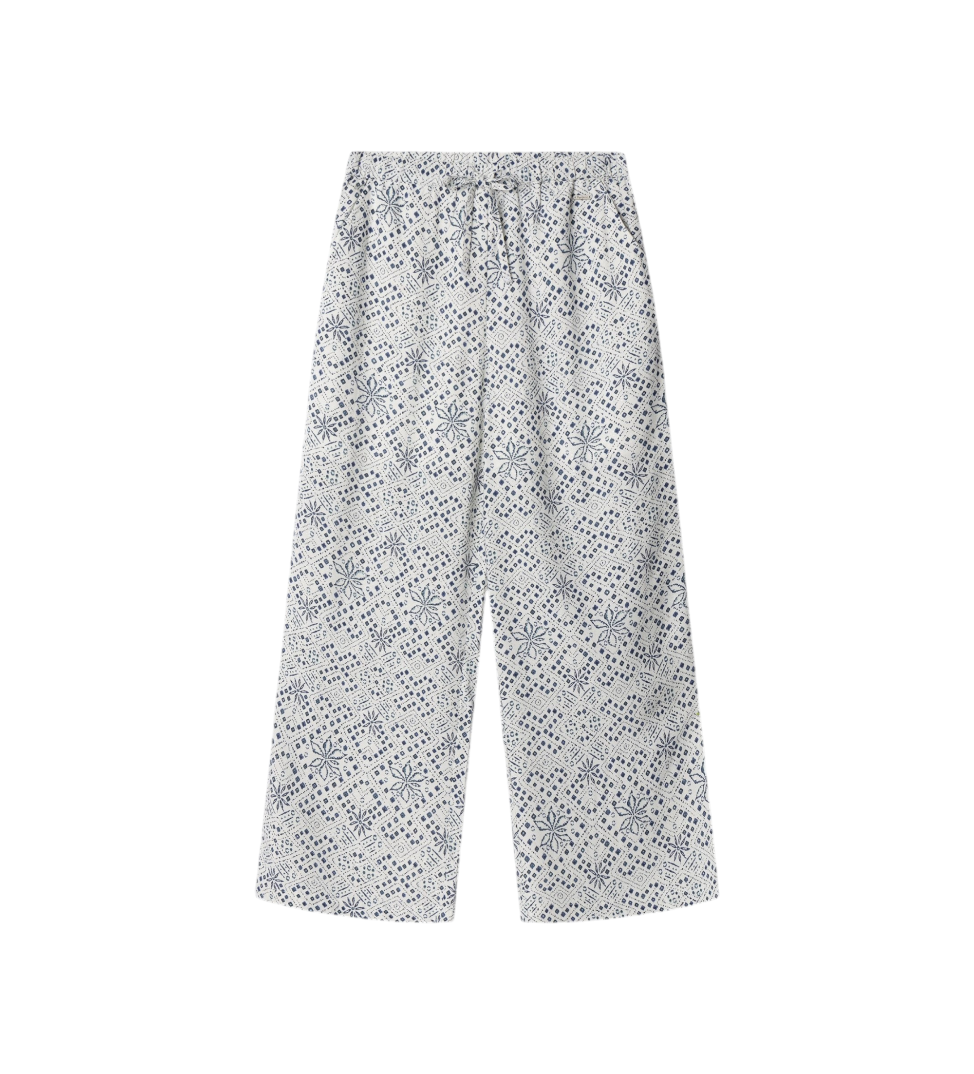 Discover these straight trousers in printed fluid rayon, a lightweight and elegant design that combines absolute comfort with contemporary bohemian style. The self-fabric waistband with adjustable drawstrings provides a flattering, tailored fit, while the soft rayon fabric and straight silhouette create a streamlined visual effect that's full of movement. Perfect for everyday, holiday or casual looks with personality.