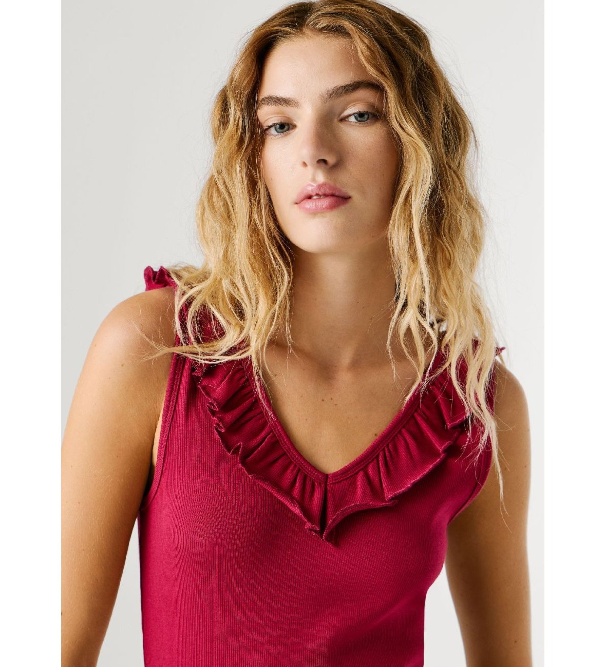 Discover the casually cut Millie tank top, perfect for enhancing your summer style with sophistication. It features an elegant v-neckline with a double ruffle around the neckline for a romantic and feminine touch. In detail, the delicately embroidered logo at the hem adds a touch of distinction. Ideal for complementing your wardrobe with a touch of freshness.