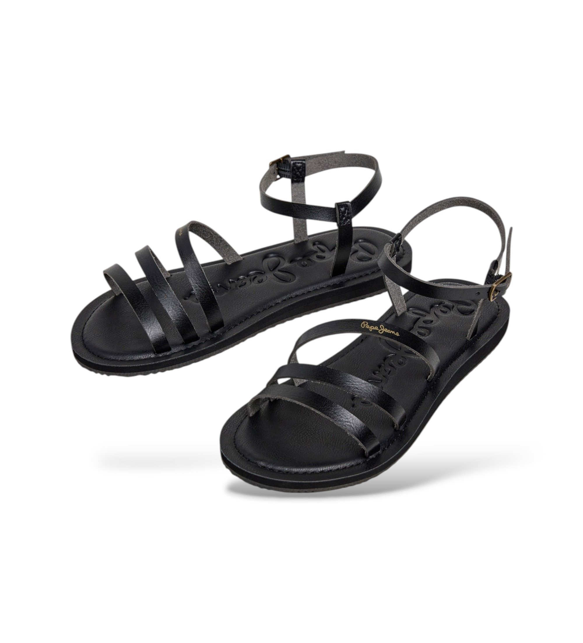 Sandal designed for women with a minimalist and contemporary design. In black with a polyurethane finish, it features three front straps and an ankle strap with a metal buckle fastening for a secure fit. Stud detailing on the upper and a metal logo plaque on the side add a subtle accent, while a classic logo on the insole completes the design. With a flat sole and lightweight profile, they offer comfort and versatility for everyday wear.