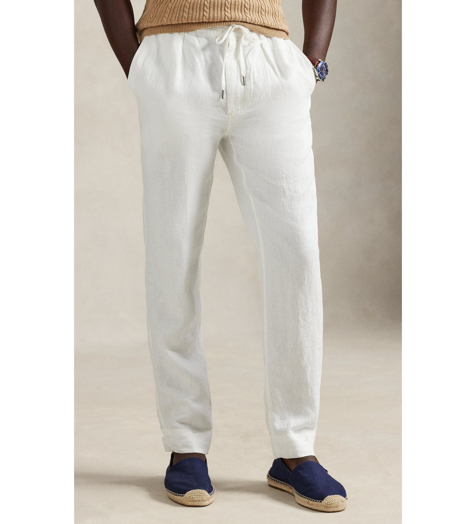 These tapered trousers are crafted from lightweight linen cloth and feature a comfortable elasticated drawstring waistband.