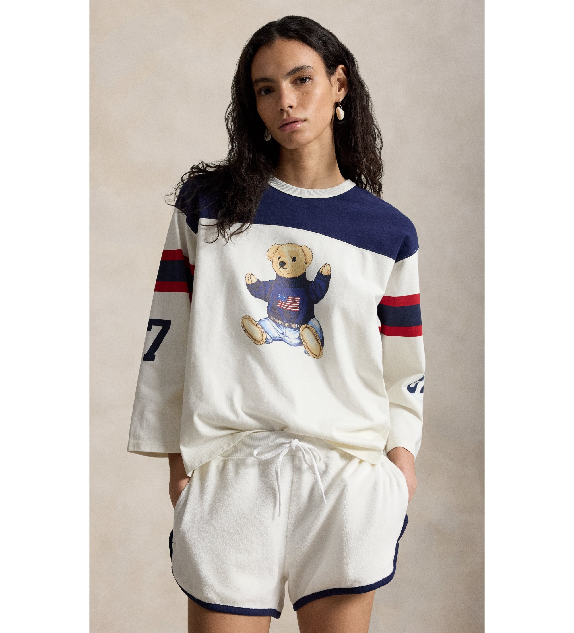 This soft cotton T-shirt in a sporty design features an oversized silhouette and three-quarter sleeves. It features a print of the iconic 1992 Polo Bear sitting on the front and is finished with the number "67" on each sleeve, a nod to the brand's founding year.