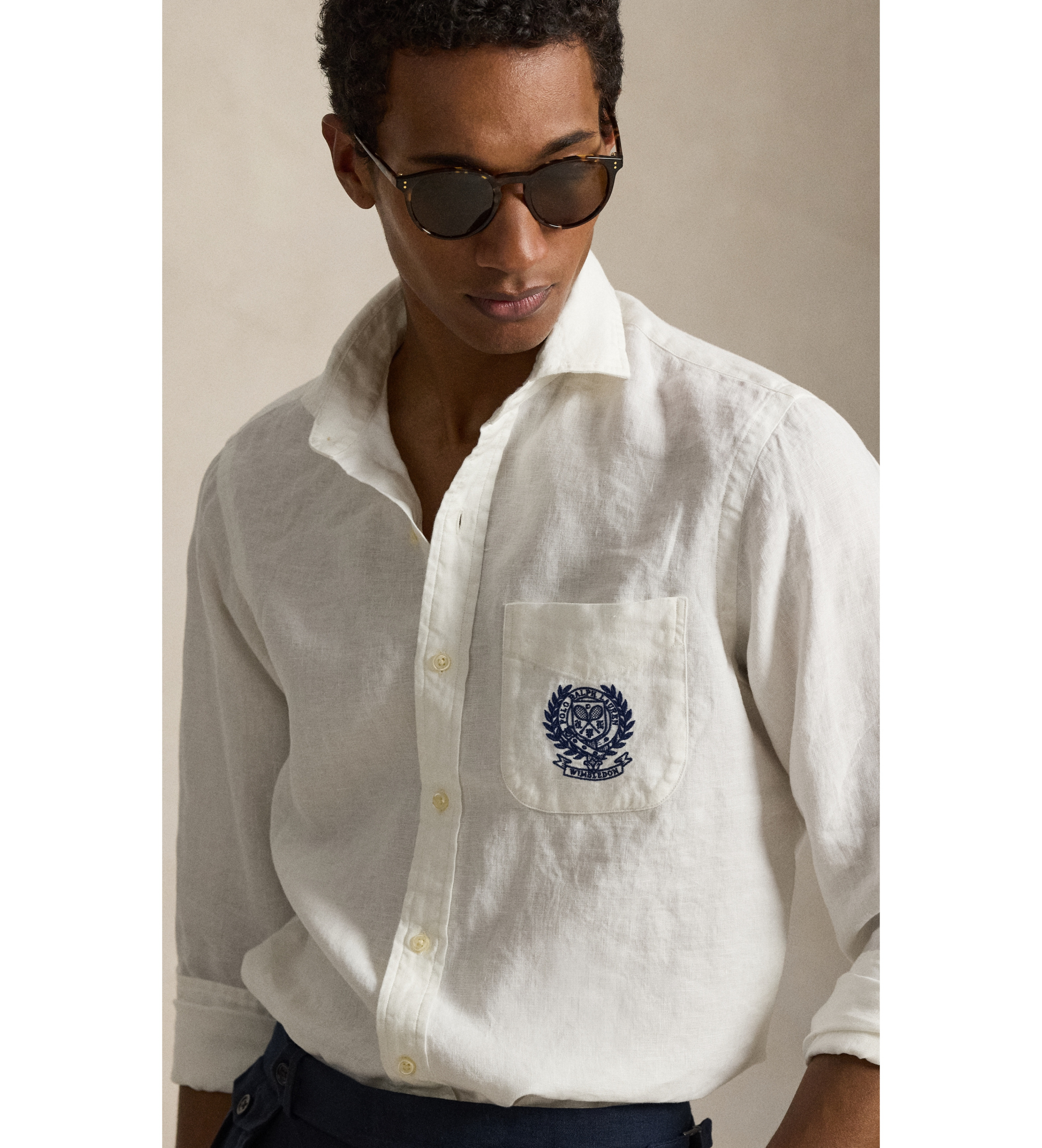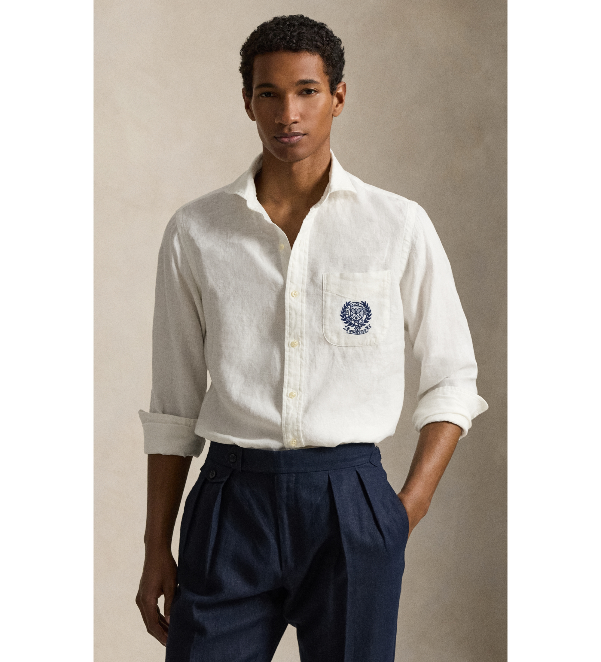 Classic cut: wider cut across the chest, waist and sleeve, with a lower armhole. The medium size has a back length of 31.5", a shoulder length of 18.25", a chest length of 46" and a sleeve length of 34.5". Sleeve length is taken from the centre of the back of the neck. Medium spread collar. Buttoned placket. Long sleeves with buttoned cuffs. Patch pocket at left chest. Tennis-inspired "Polo Ralph Lauren" crest with embroidered "Wimbledon" banner on pocket. Split pleated back yoke ensures soft, contoured shoulders. 100% linen. Machine washable. Imported. Model is 6'1" (185 cm) wearing a size medium. Ralph Lauren is proud to be the official supplier of the 2026 Wimbledon Championships.