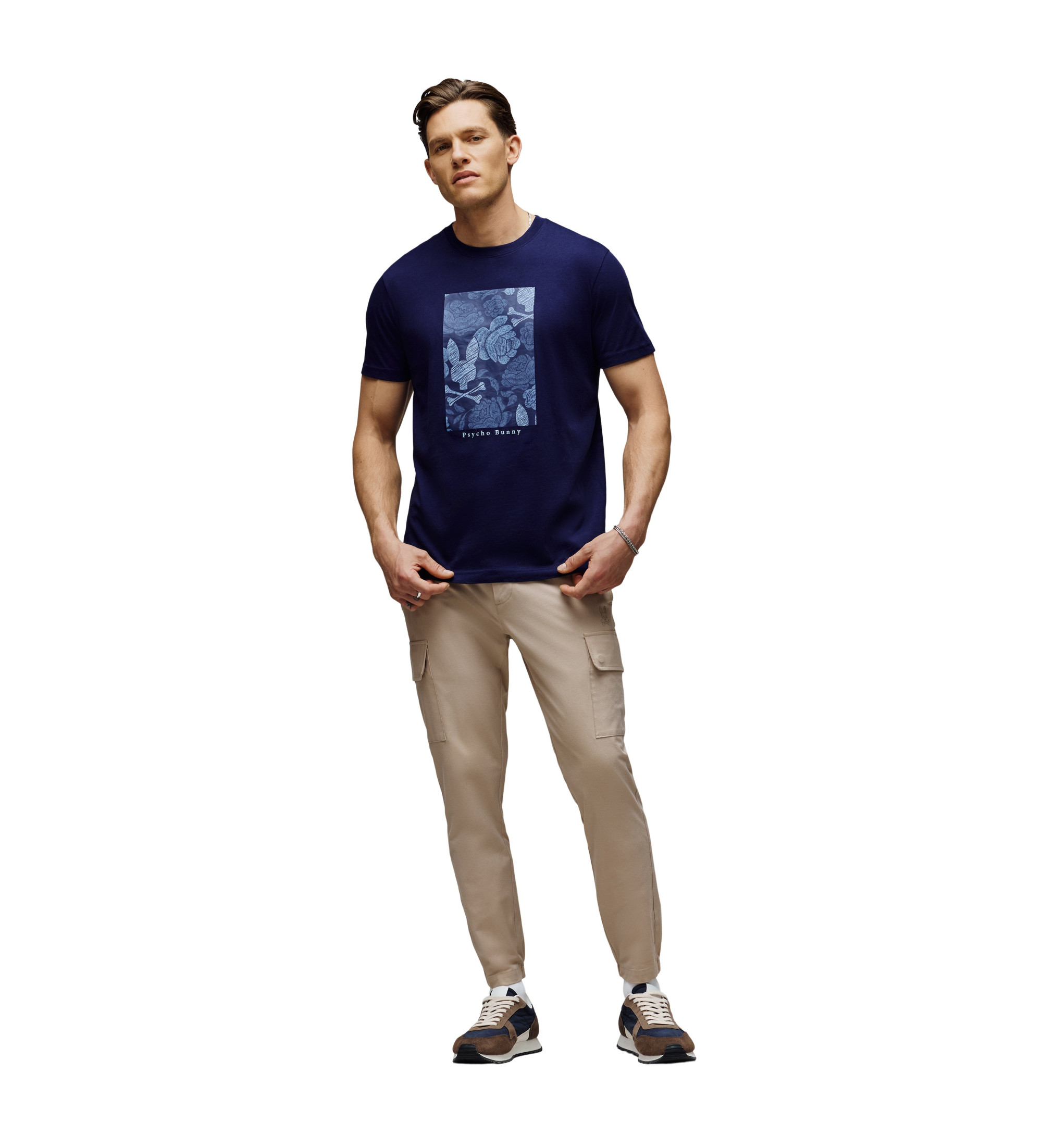 Psycho Bunny brand T-shirt in navy blue, designed to bring style and comfort to your day to day. It features a floral print on the front and the brand's iconic logo, which gives it a modern and distinctive touch.