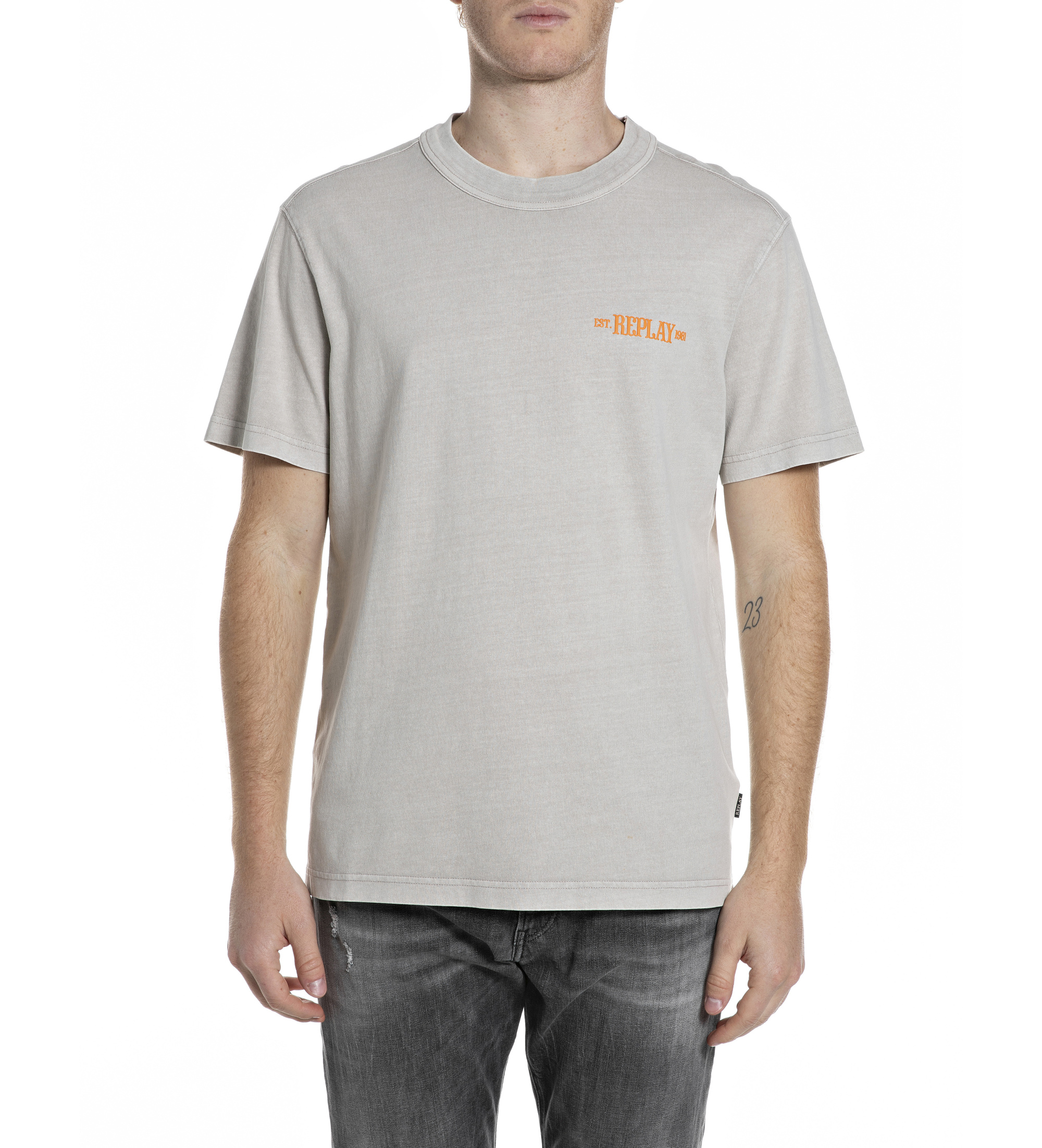 Replay short-sleeved T-shirt in stone grey with a garment dye finish for an authentic, slightly worn-in character. The understated orange embroidered logo on the left chest adds a touch of brand identity without compromising on understatement. A seasonal essential designed for those who value quality and effortless style.