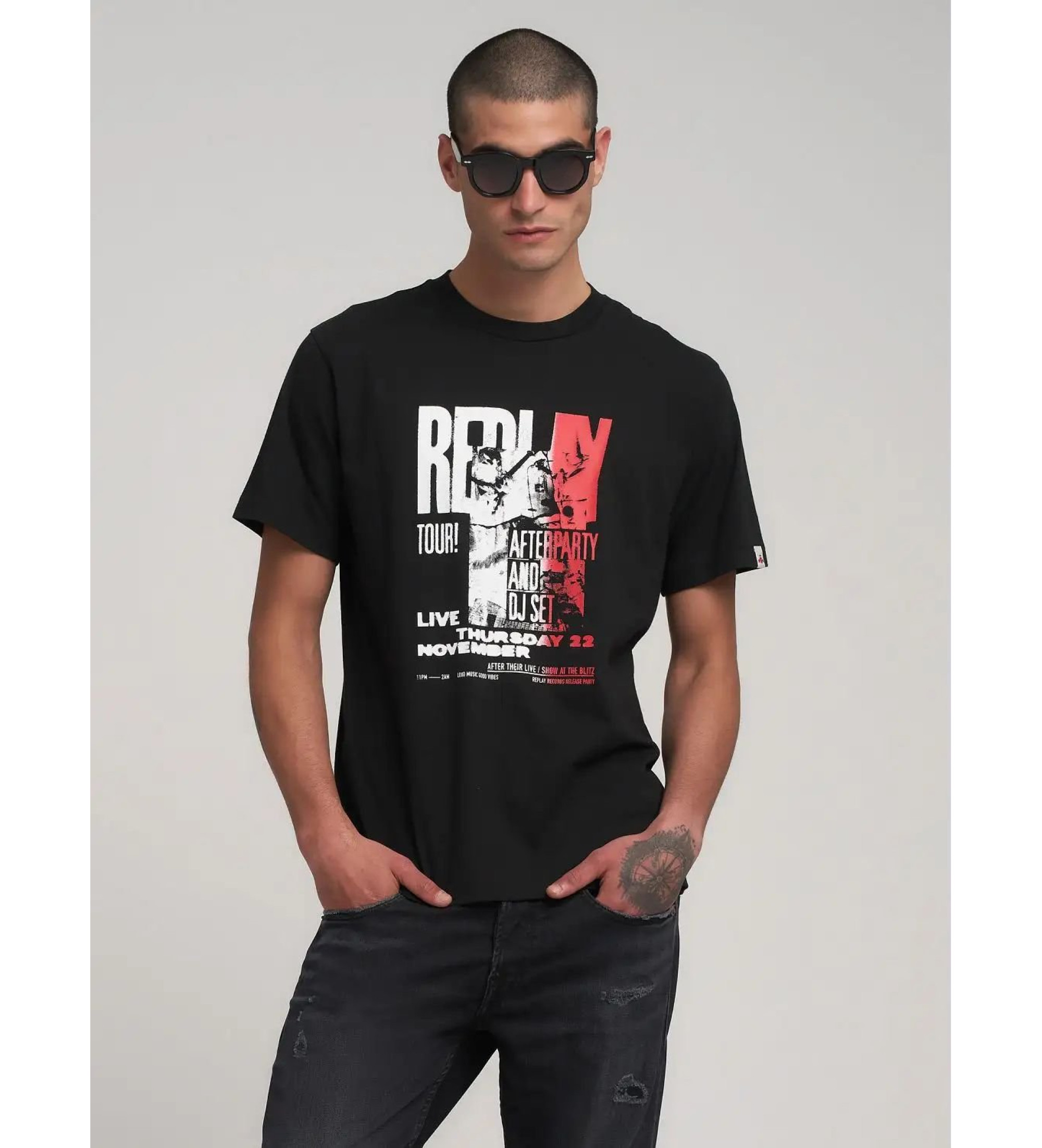 Round-neck T-shirt in pure cotton jersey, guaranteeing softness and durability. This regular fit, short-sleeved T-shirt features a customised maxi print on the front inspired by the music event scene. The iconic archive logo label on the sleeve completes the design.