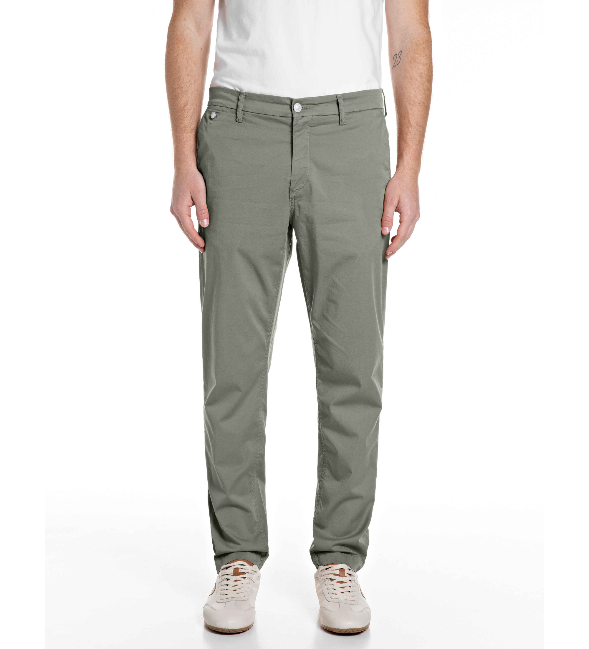 Regular fit chino jeans with regular waist and leg. The five-pocket garment is made from 5oz stretch cotton bull denim, extra light and garment dyed with antique effect dye and treated with final softener. These men's trousers have two French side pockets, one of which is completed with a fifth pocket, and two double welt pockets at the back, one of which is embellished with the iconic R embroidery.