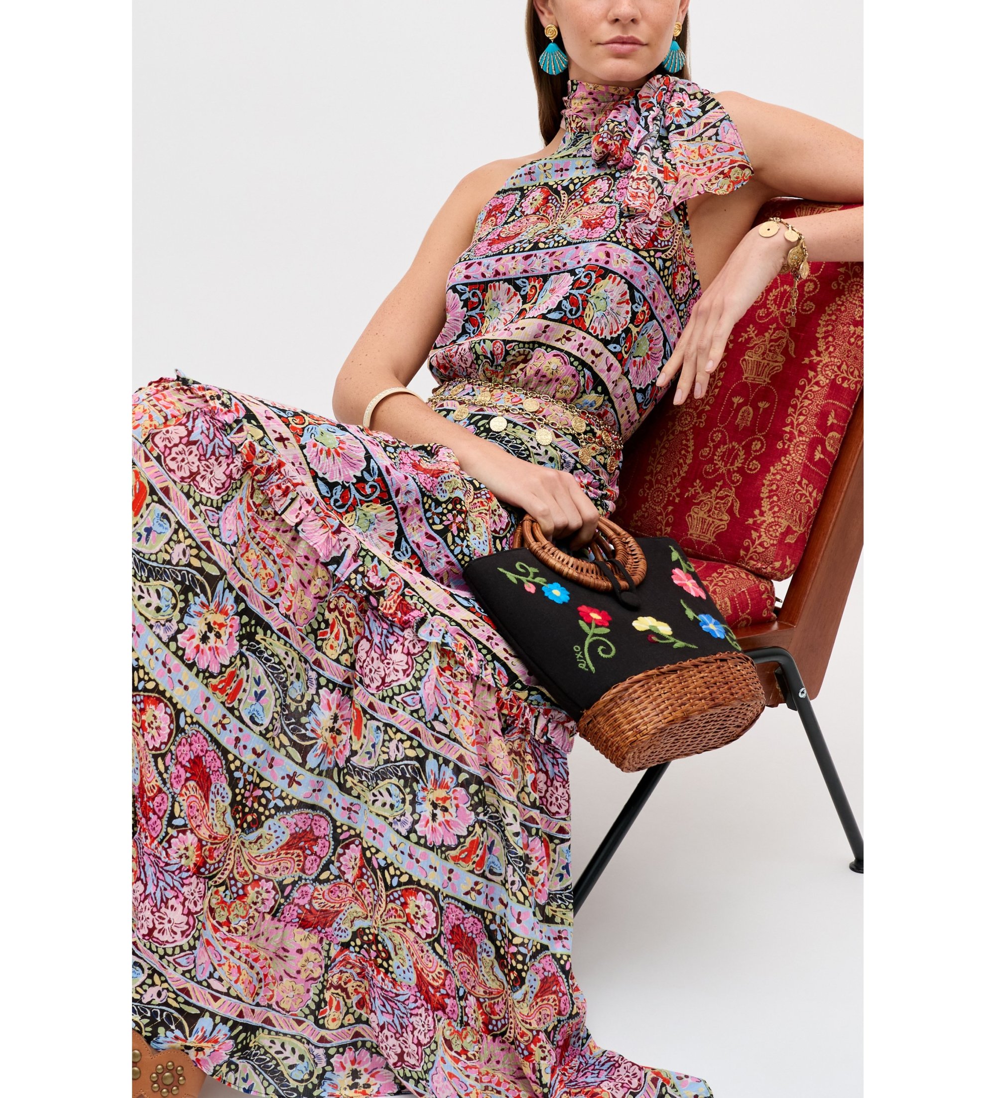 A dress designed for those who know that elegance and joy are not opposites. The Abi Dress by RIXO instantly captivates with its floral paisley print in multicoloured stripes - shades of pink, sky blue, red and black - reminiscent of the finest textile craftsmanship. The asymmetric halter neckline with ruffle on the shoulder adds a casual femininity, while the tiered midi skirt with flounce ensures irresistible movement. Crafted from a blend of rayon, silk and metallic thread, its flowing drape and subtle sheen make it the perfect choice for special occasions, summer weddings or Mediterranean getaways.