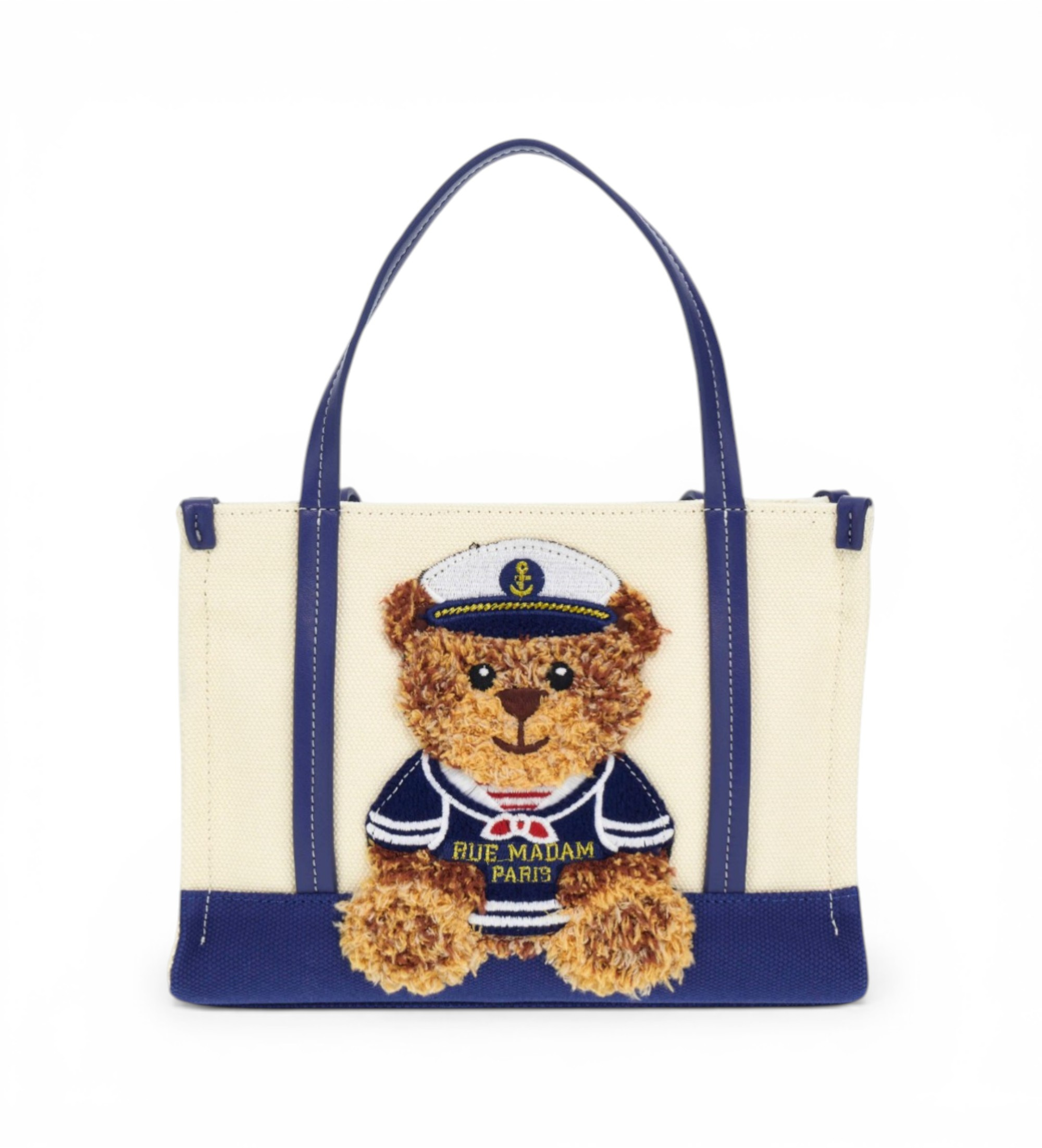 Soft canvas mini shopping bag with a fun and contemporary design, enriched with the new Sailor Marvin teddy bear plush effect embroidery, which adds an original and endearing touch. The contrasting base, combined with the faux leather handles and details, elegantly enhances the structure. Zip closure and cotton-lined interior with pocket, ideal for practical everyday organisation. Dimensions: 27 x 20 x 10 cm (L x H x W).