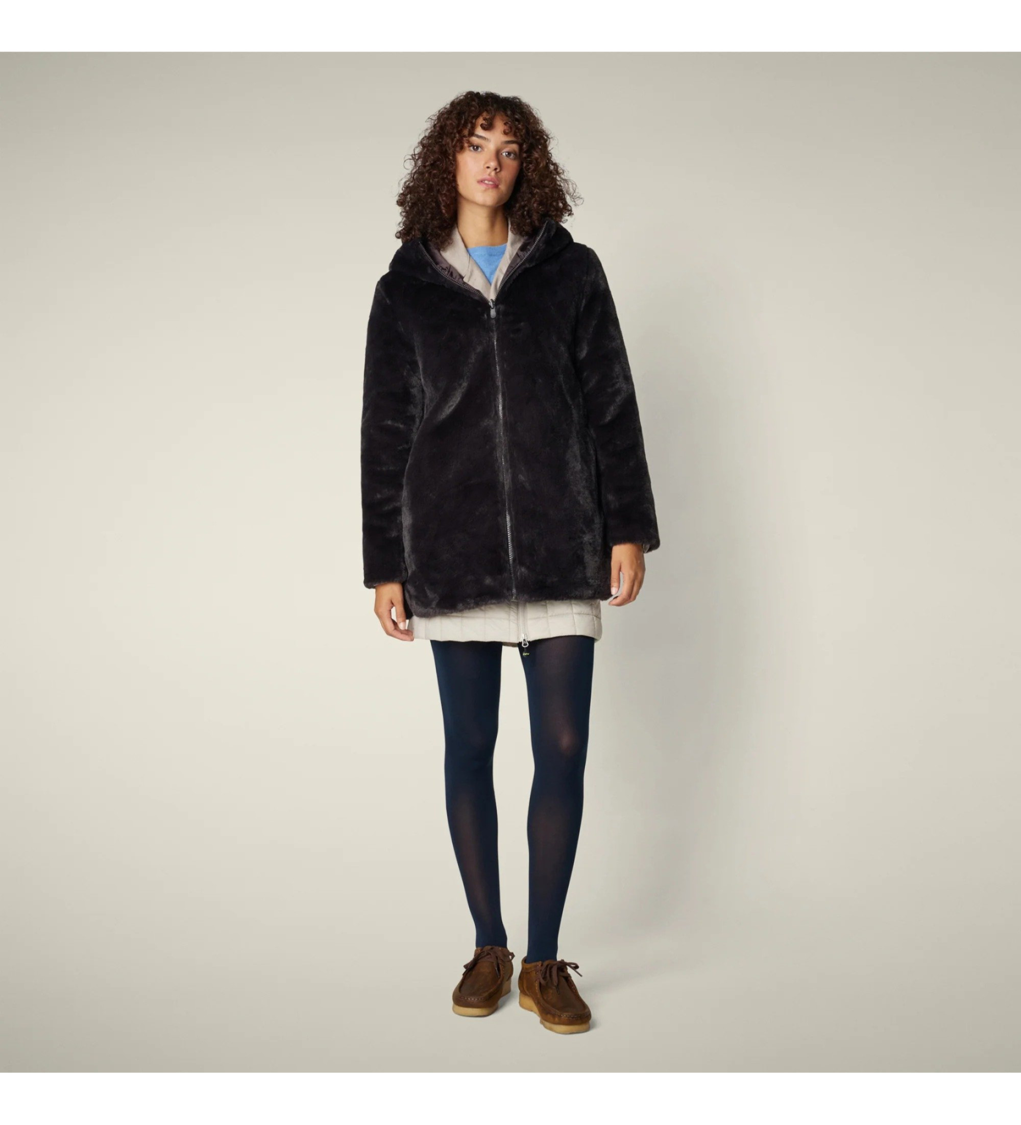 A non-animal-derived alternative to the classic women's fur coat, the Bridget quilted jacket is a long, reversible style with one side quilted and the other in soft recycled polyester faux fur. It features a wide hood and concealed lower pockets on both sides. Complete with a central zip with reversible slider and custom puller, plus a tonal logo detail on one side.