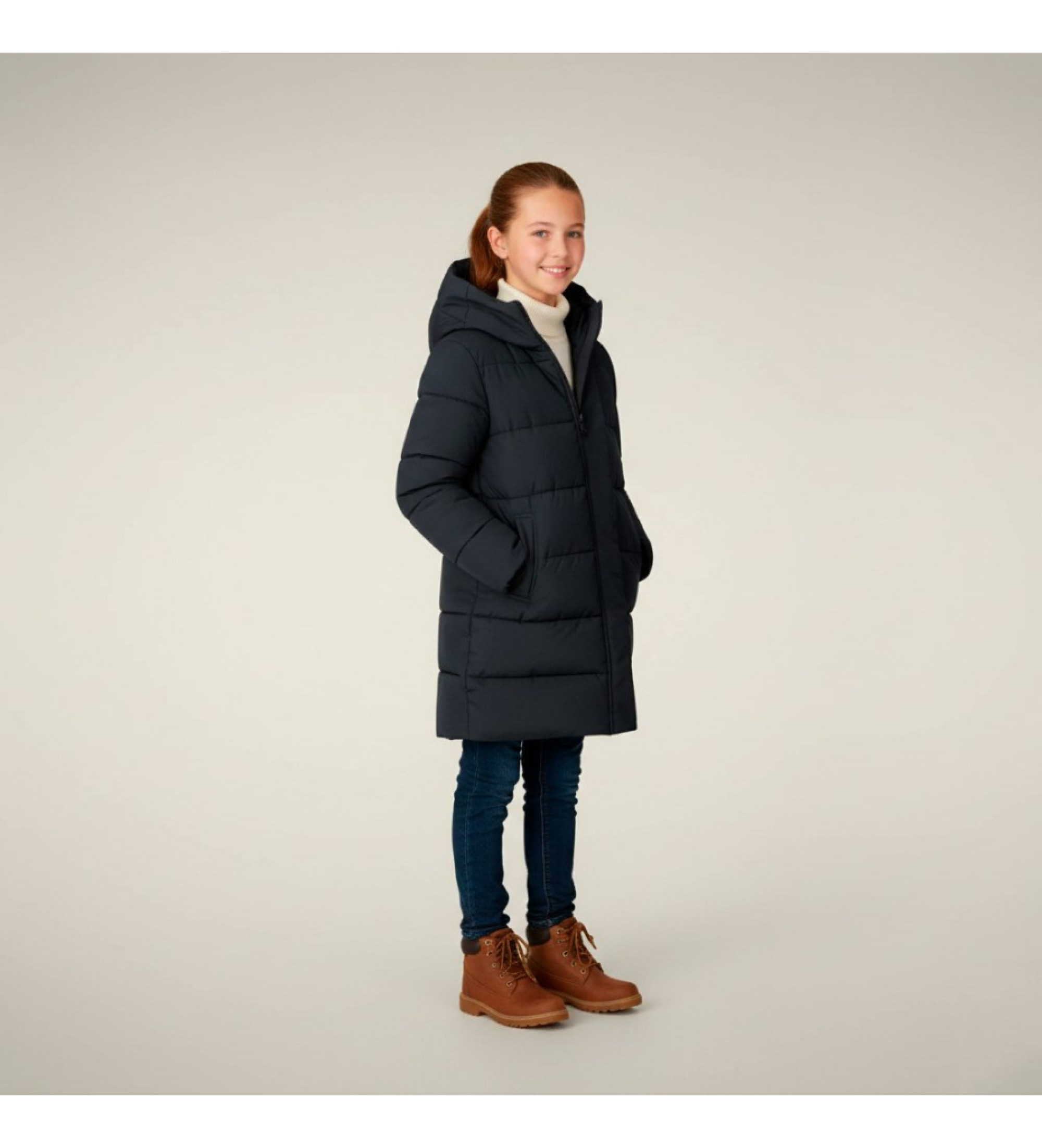 Enjoy animal-free style for the whole family with the Trini girls' parka, perfect for colder days. This quilted design offers excellent protection against the cold with practical features such as a wind flap over the zip and button fastening, knitted inner cuffs and a cosy hood. Distinctive details include a round logo on the shoulder and an orange zip puller for a distinctive touch.