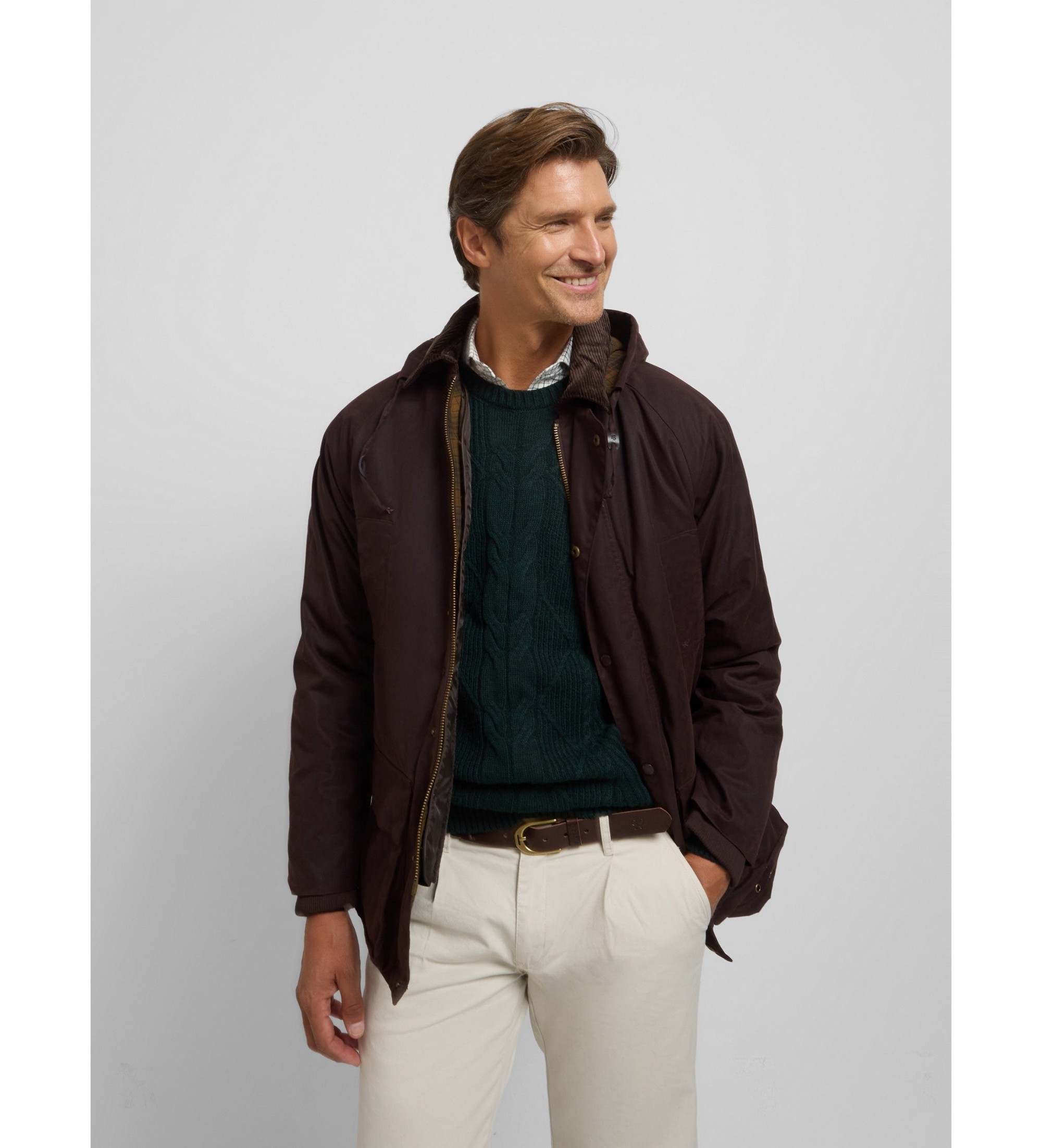 Dark brown classic coat in 100% waxed cotton with a straight cut. Features front patch pockets with flap and inset front pockets, two-way metal zip front fastening with tone-on-tone metal snaps, classic corduroy collar and detachable synthetic inner lining with snaps. Features detachable hood with custom check lining. Features personalised embroidered rackets on pocket.