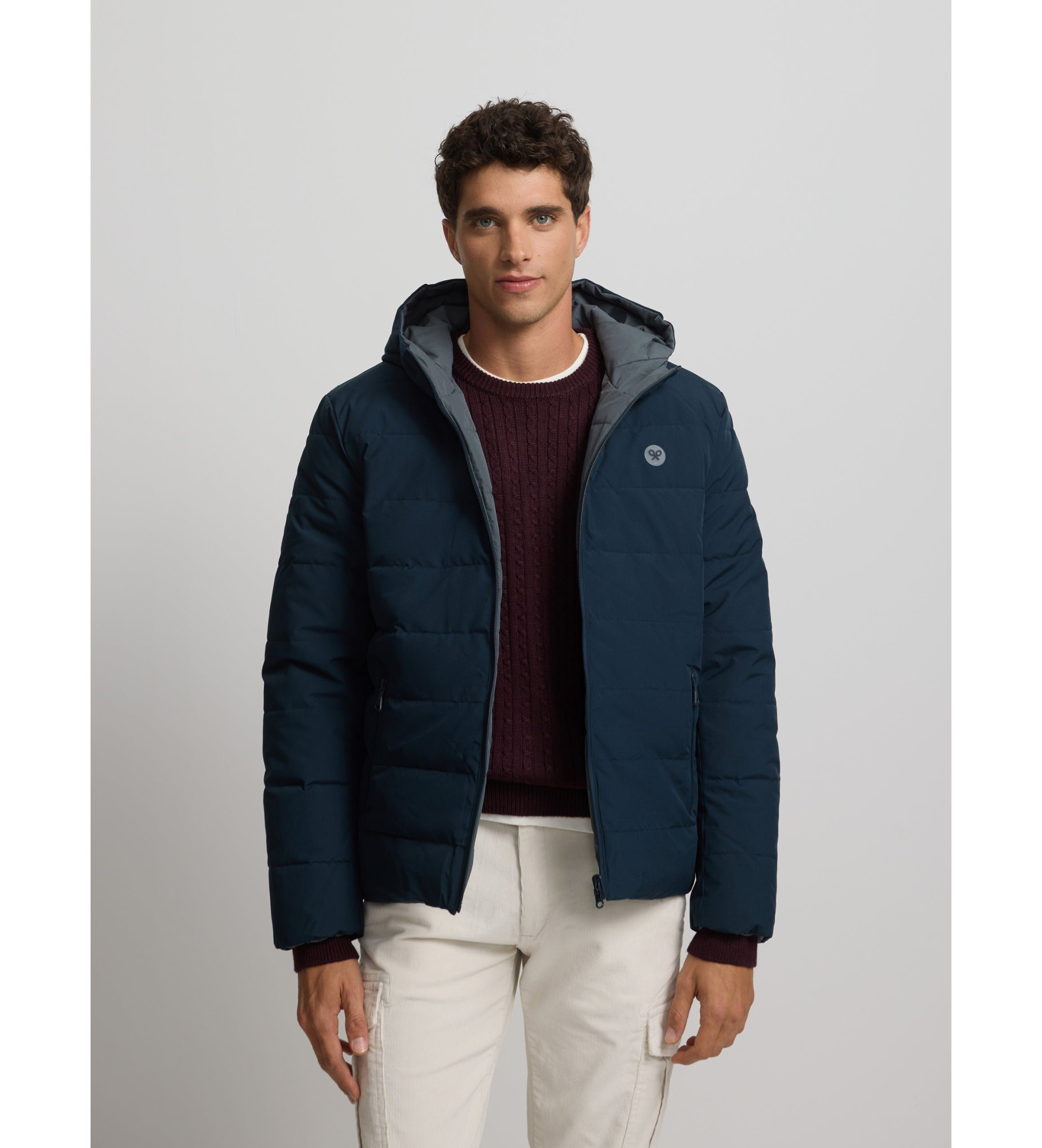 Reversible technical coat in navy blue and grey, with regular fit. Features front zip and front pockets with heat-sealed zips, personalised zip pulls and stand-up collar with hood. Features micro-injected racket patch on torso.