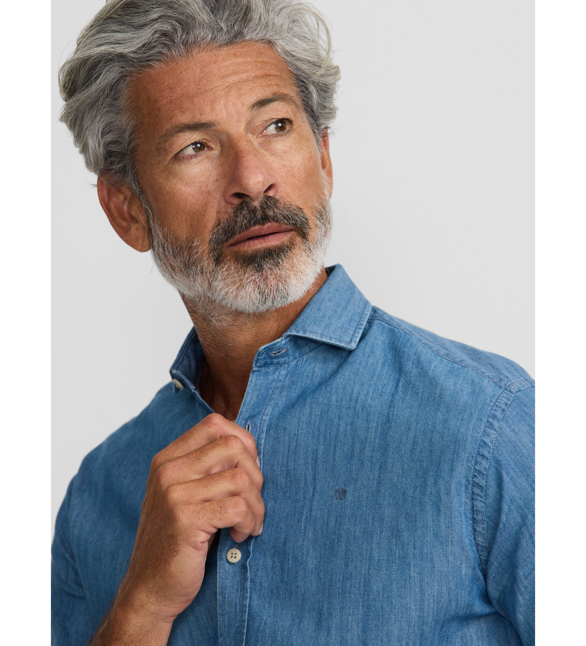 Navy blue denim sport shirt made from 100% BCI cotton. Features cutaway collar, custom button fastening and long sleeves with button cuffs. Features embroidered rackets on the torso.