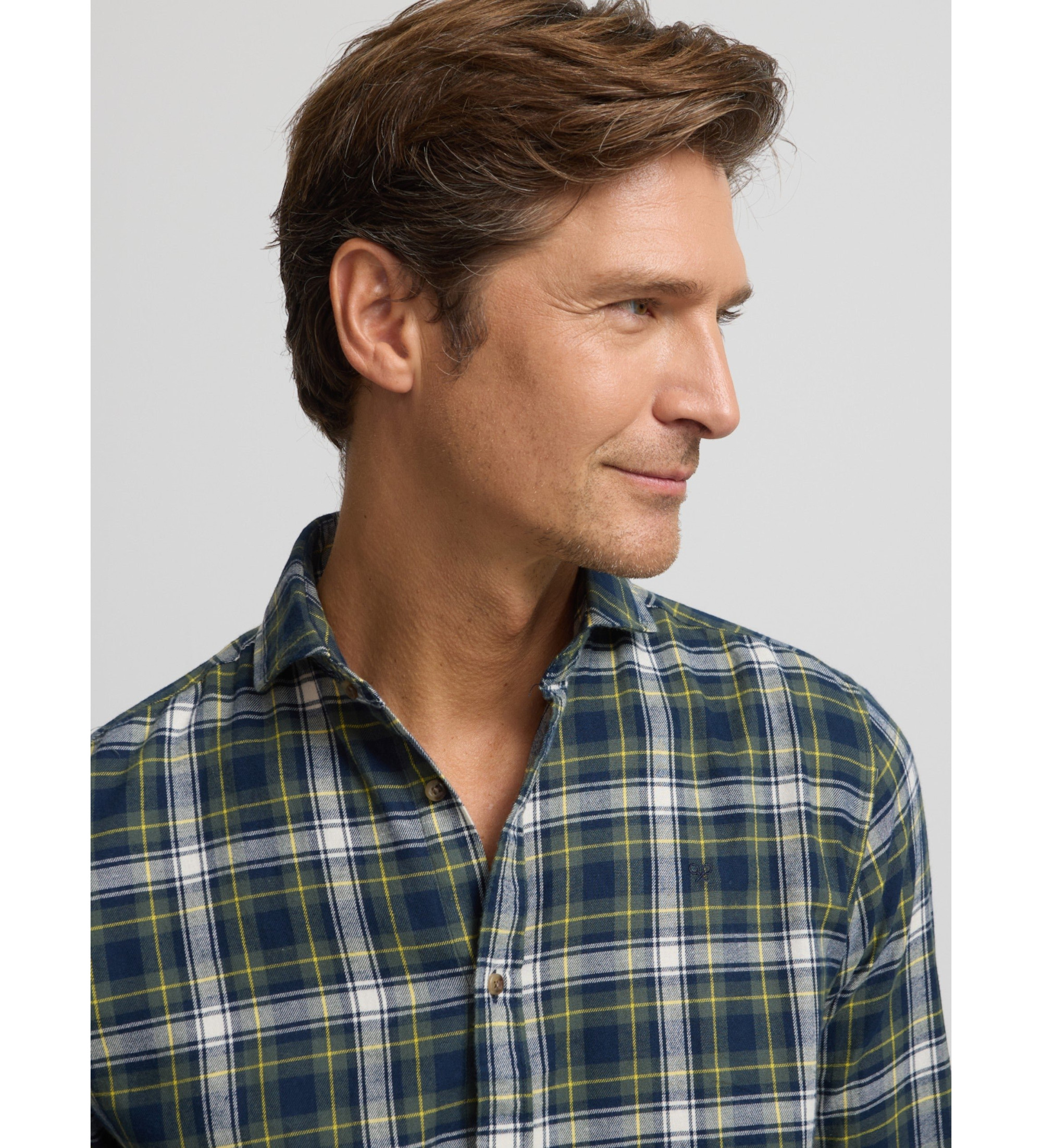 Two-tone tartan shirt made from 100% BCI cotton. Features cutaway collar, custom button fastening and long sleeves with button cuffs. Features contrast embroidered rackets on the torso.