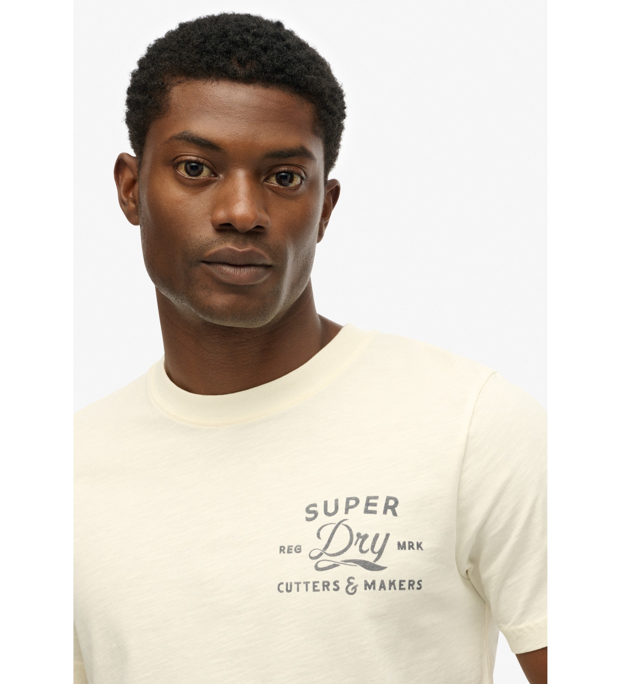 The Superdry Cutters And Makers t-shirt has a relaxed fit with a relaxed fit that is neither too tight nor too loose, perfect for any occasion. It features a ribbed crew neck and contrast stitching along with subtly placed graphic prints on the chest and back. The branded label on the sleeve adds an authentic touch to this garment designed for lovers of vintage style.