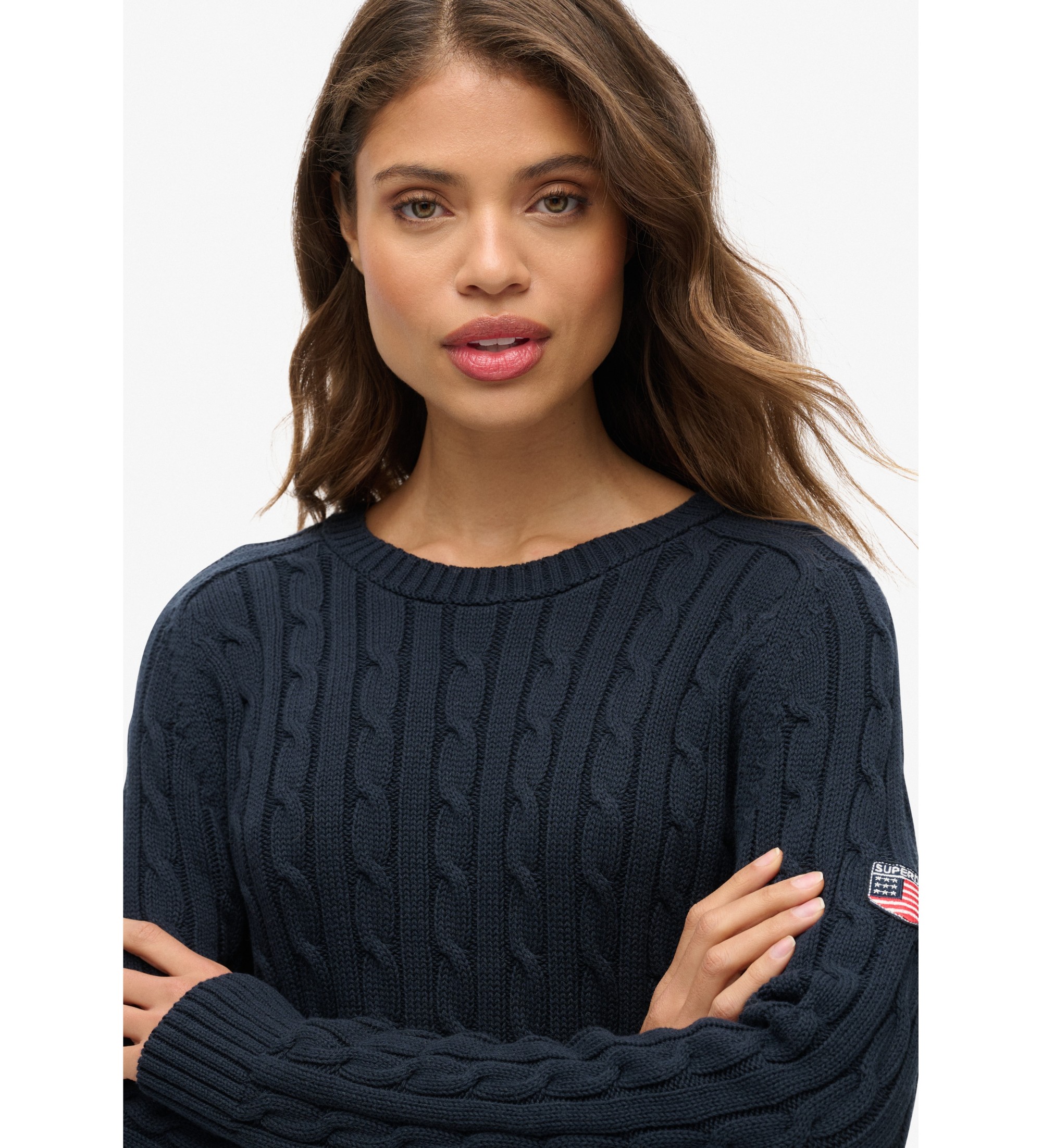 With a roomy, elegant design, this cable-knit jumper is a must-have for the season ahead. Its loose fit makes it the perfect choice for layering looks, while the knitted fabric and thoughtful details - such as the round neck, ribbed cuffs and embroidered sleeve label - lend a sophisticated yet casual finish.