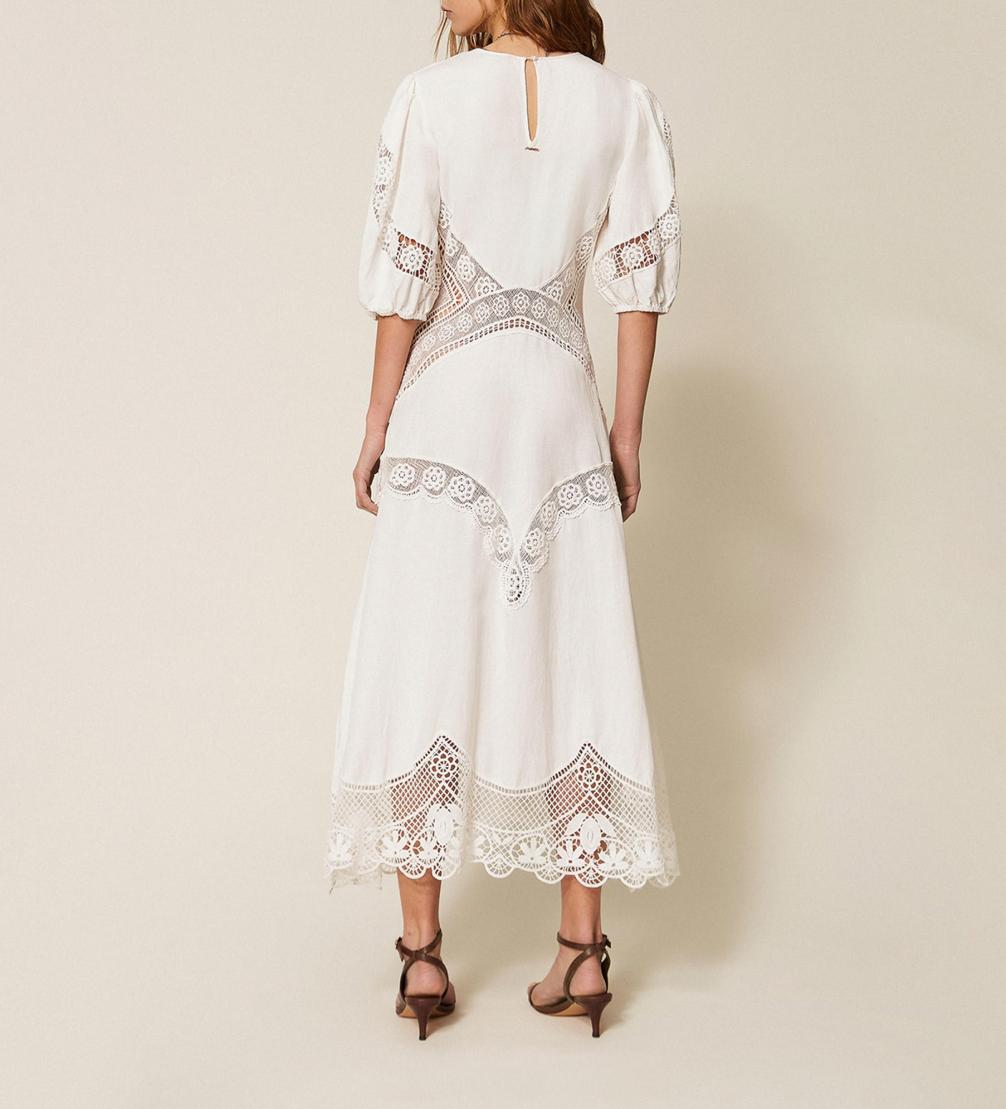 Long dress in a linen and viscose blend with embroidered mesh inserts and floral motifs. It features a round neck, heart-shaped yoke, slightly puffed three-quarter length sleeves with gathers at the armholes, zip fastening at the side, scalloped bottom and fit & flare cut.