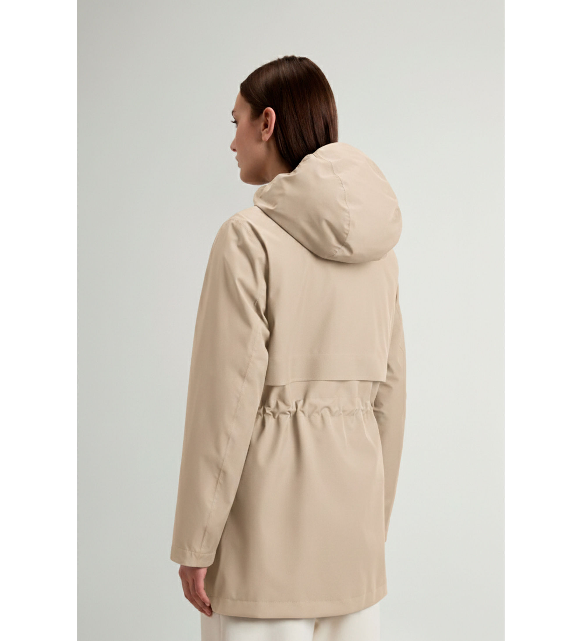 This 3-in-1 parka is designed for versatility and protection through modular construction. The outer layer is made from waterproof, windproof and breathable Light Stretch fabric, designed to accompany you through everyday use even in changeable weather. The model features a hood, waist adjustment with inner stoppers and welt pockets with snap buttons, plus a front zip closure. Inside, the removable quilted gilet can be worn separately or attached to the parka with a special system, offering a flexible solution to suit different needs. The Woolrich print on the hood and the flag label with logo on the side complete the garment.