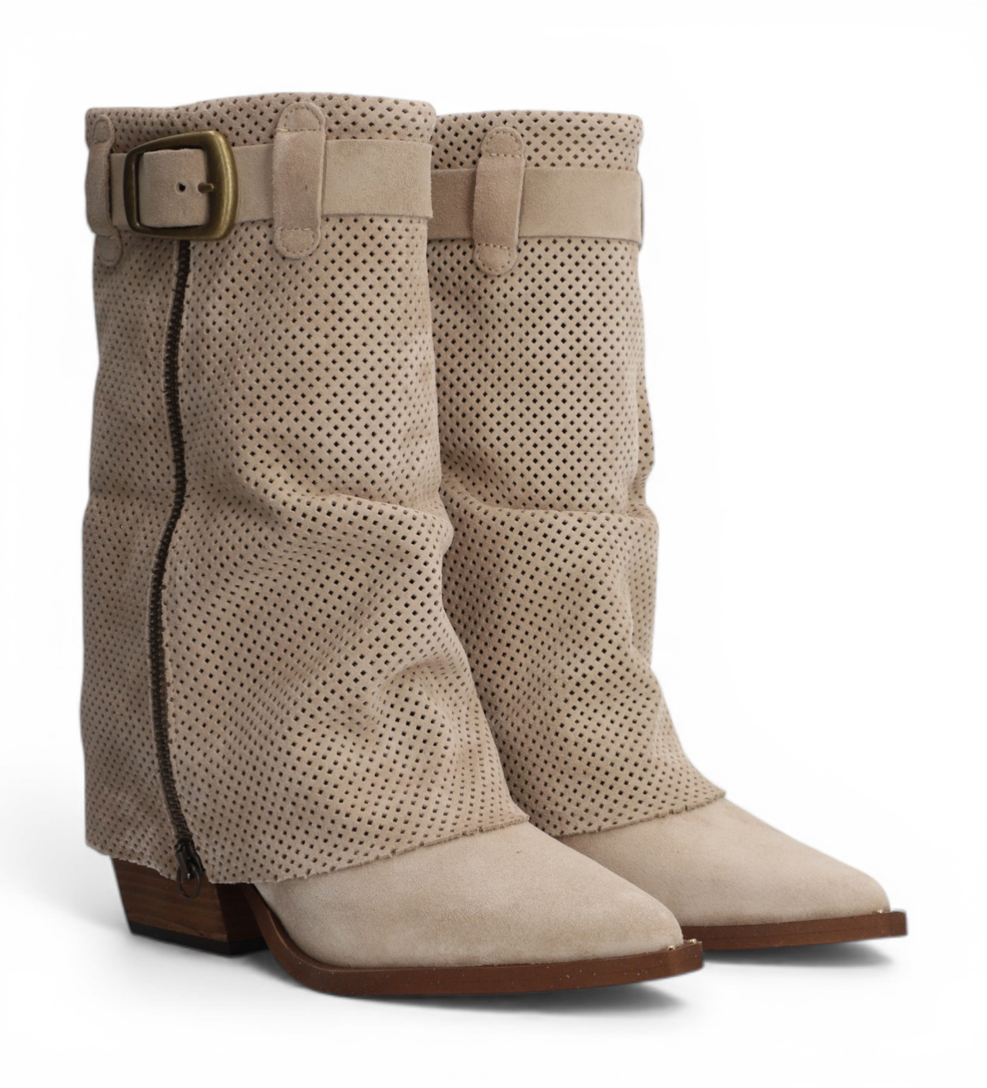 Bota de ante perforado en tono arena con caña alta y detalles en bronce envejecido, una pieza con mucha personalidad que fusiona la estética cowboy con un espíritu más urbano y contemporáneo. Su caña perforada le aporta un carácter único y una ligereza visual que la distingue de cualquier bota convencional, perfecta para looks de temporada que buscan un calzado protagonista.