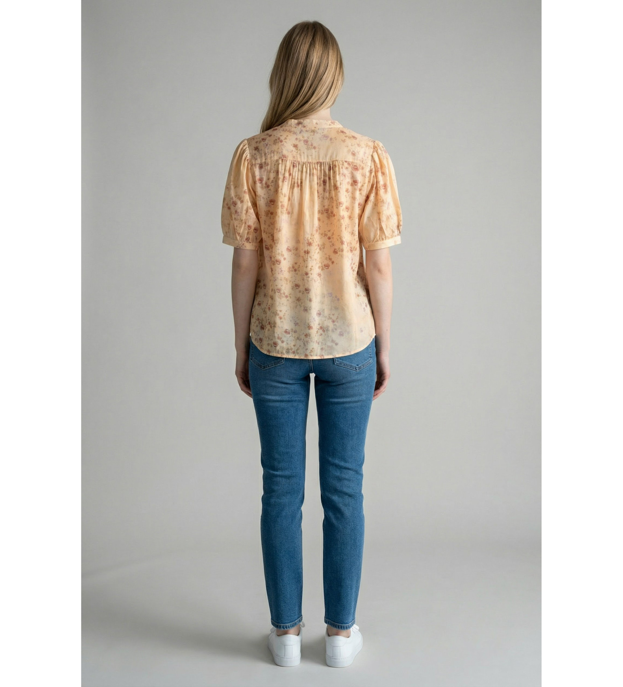 Blusa de chifón en tono melocotón con estampado floral en tonos coral y terracota. Su diseño romántico y delicado la convierte en una pieza ideal para looks frescos y femeninos, perfecta tanto para el día a día como para ocasiones especiales.