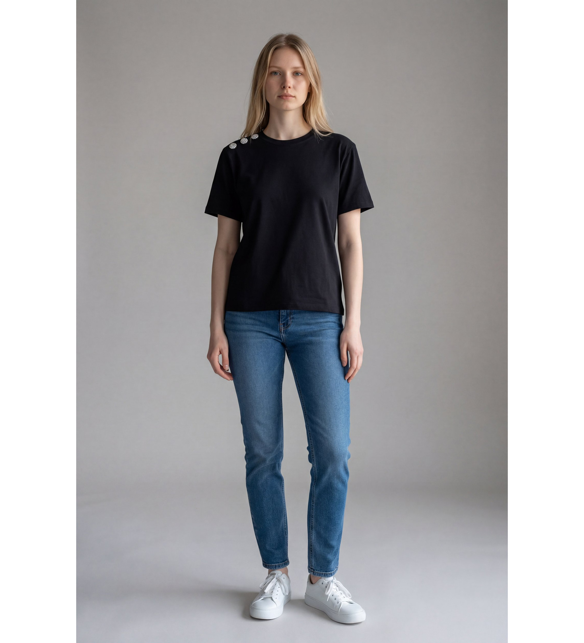 Una camiseta negra que eleva el básico con un detalle inesperado: tres botones con pedrería en el hombro izquierdo. Corte recto y limpio, manga corta, cuello redondo. El negro absoluto funciona como lienzo para que los botones brillen sin competencia.