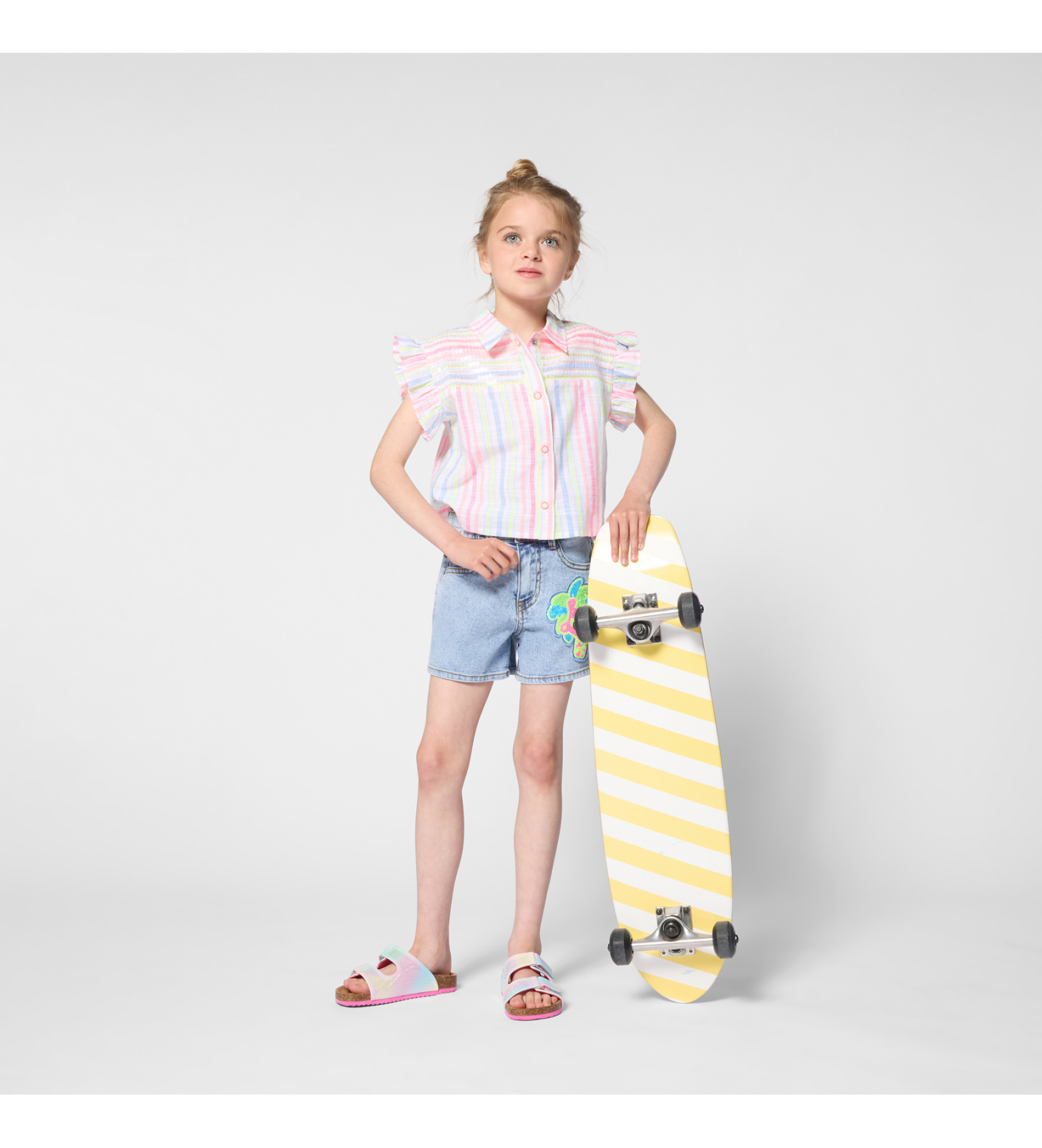 Shorts vaqueros de corte holgado con ilustración de lentejuelas, bordados y tachuelas como elemento protagonista. Una pieza con actitud y brillantez que transforma el clásico denim en un diseño festivo y lleno de personalidad con los detalles artesanales distintivos de Billieblush.