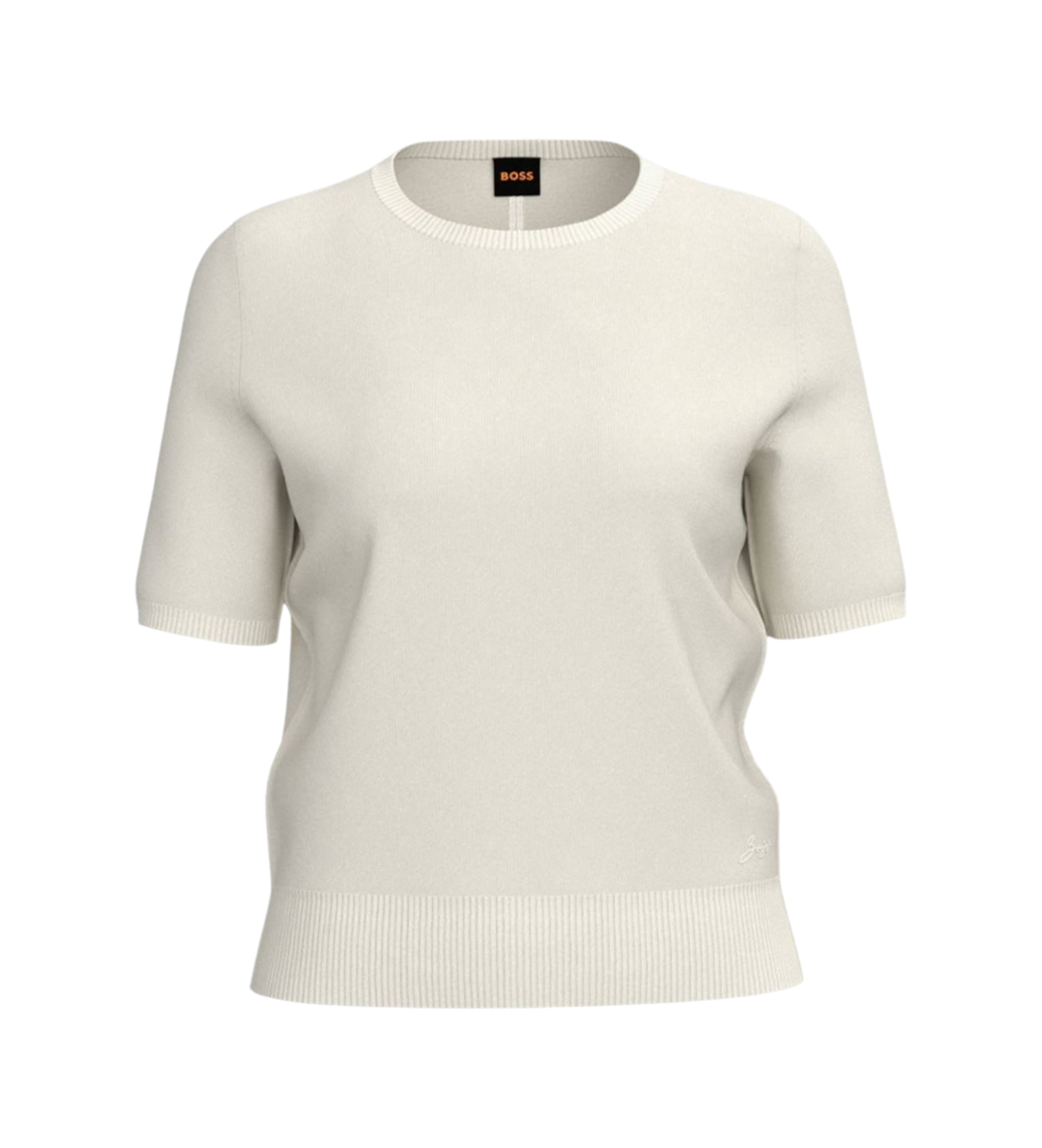 Presenta cuello redondo clásico y mangas cortas, con acabados acanalados que aportan estructura y un toque refinado al conjunto.