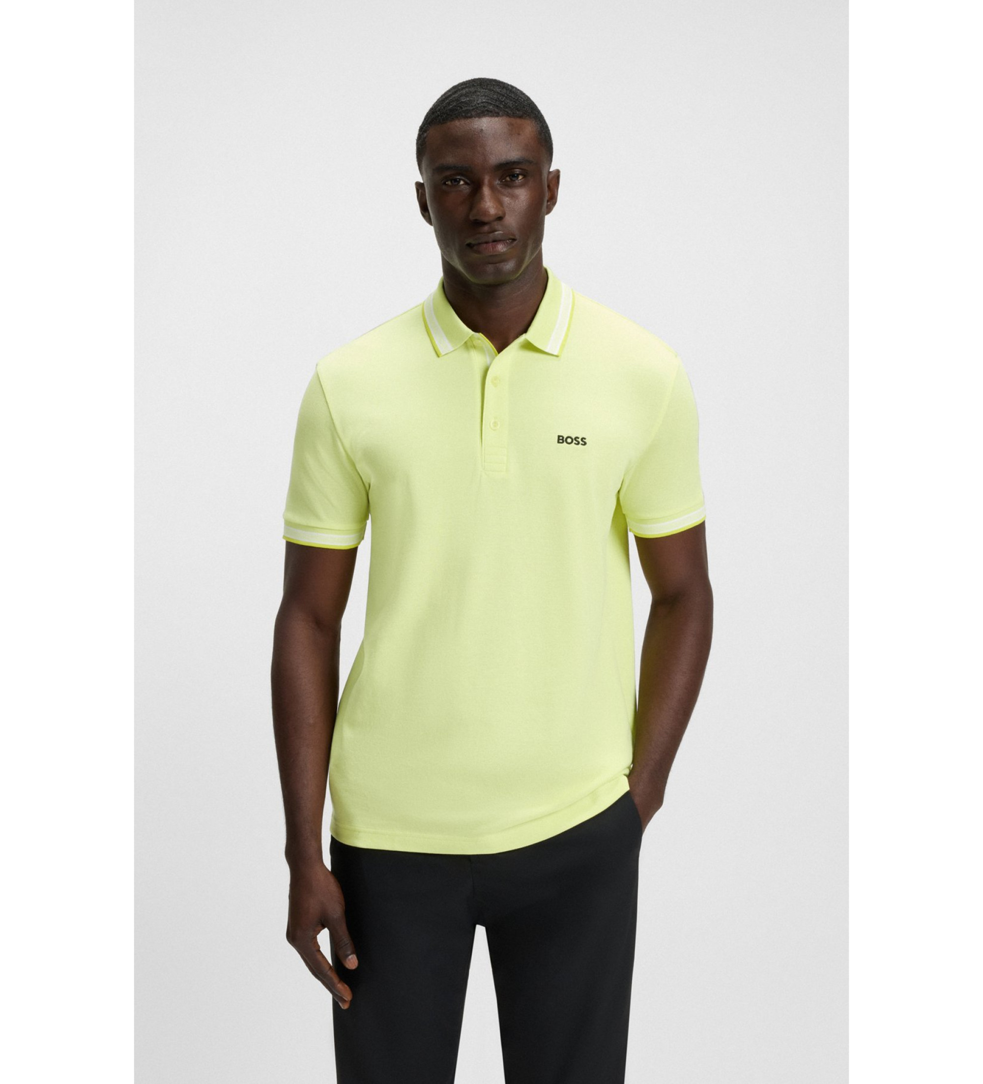 Un polo BOSS regular fit en tejido de piqué transpirable. Esta prenda se presenta con rayas deportivas y detalles de la marca en contraste.