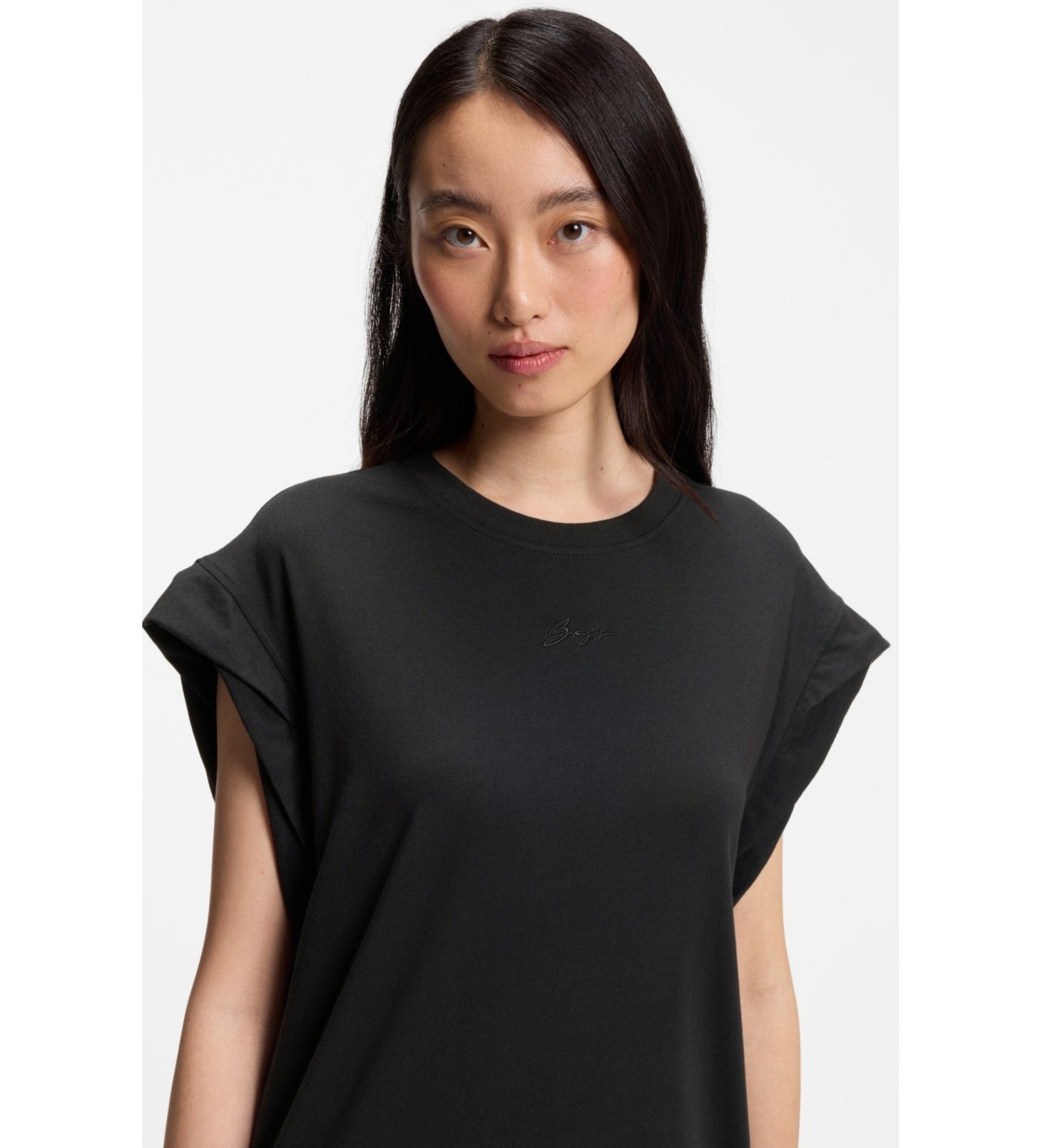 Vestido de punto de corte relaxed fit pensado para mujer. Confeccionado en punto elástico con predominio de modal, destaca por su tacto suave y caída natural; las aberturas laterales y la manga casquillo definen una silueta cómoda y de líneas limpias. El pequeño logo con trazo manuscrito en el pecho aporta carácter sin restar sobriedad, mientras que el color negro lo convierte en una pieza versátil para looks contemporáneos de estilo casual.