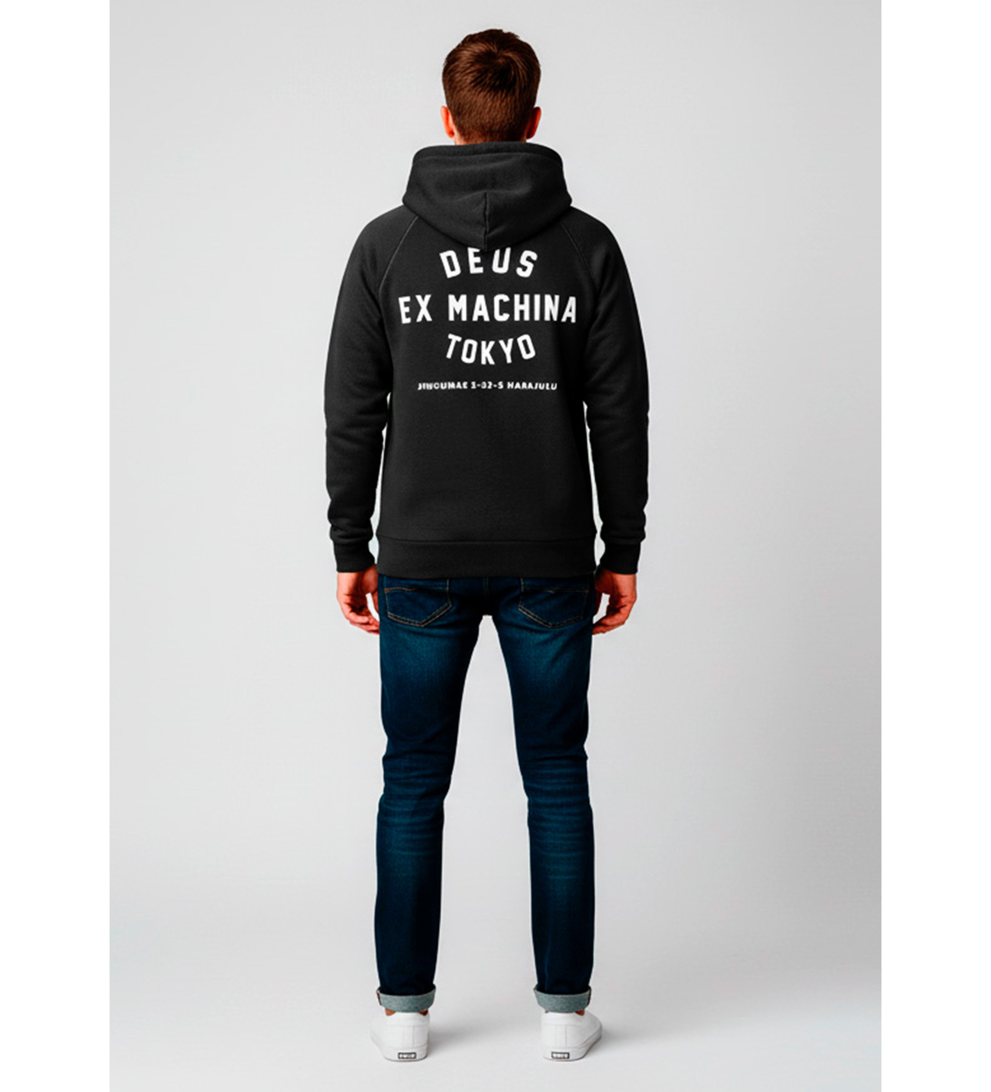 Sudadera con capucha raglán de corte regular con estampado clásico de dirección. Confección en polar cepillado de algodón orgánico OE con lavado en prenda.
