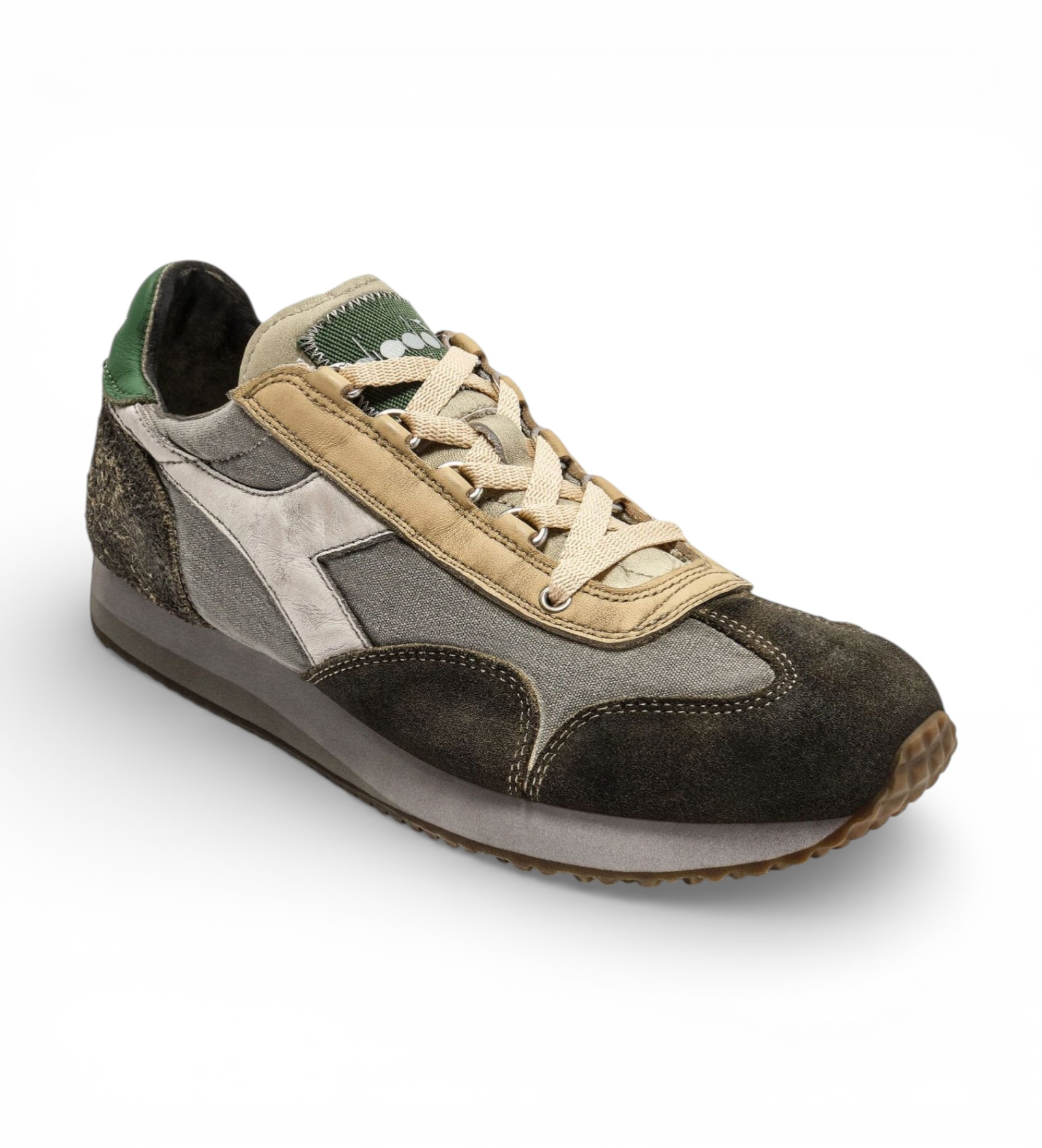 Zapatilla Equipe Dirty SW Evo de Diadora en ante, una pieza que rescata el espíritu de los archivos de 1975 con un tratamiento artesanal de efecto ensuciado y lavado a piedra que la convierte en una zapatilla de herencia con una autenticidad vintage inigualable. Como si hubiera resurgido directamente de los años 80, su encanto reside en ese equilibrio perfecto entre lo imperfecto y lo sofisticado.