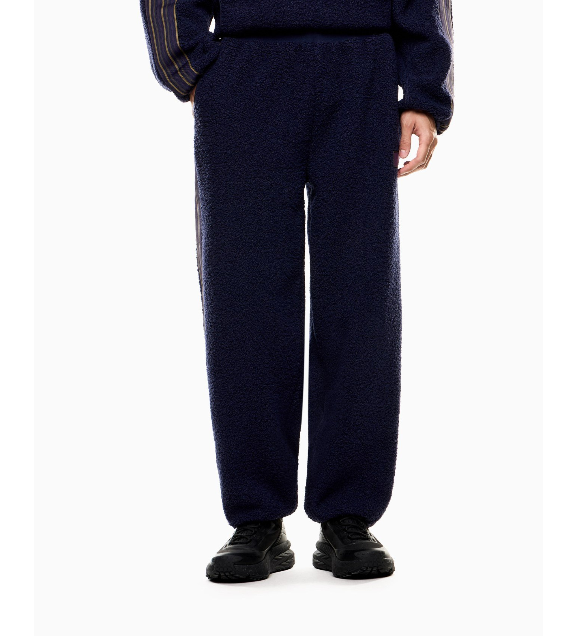 Pantalones confeccionados en un original y suave tejido efecto peluche y adornados con un motivo de cinta de grogrén en el borde de las perneras. El modelo, con cordón en la cintura y dos bolsillos laterales, está personalizado con un parche de goma, común a otros artículos de la misma línea. La prenda forma parte de la nueva propuesta 7.0, la colección EA7 dedicada a los deportistas más exigentes, que buscan no solo funcionalidad, sino también un look siempre en sintonía con las nuevas tendencias. Presentada en clave unisex, la colección se caracteriza por los volúmenes suaves y cómodos y la personalización con el motivo de 7 líneas y los audaces juegos de colores.