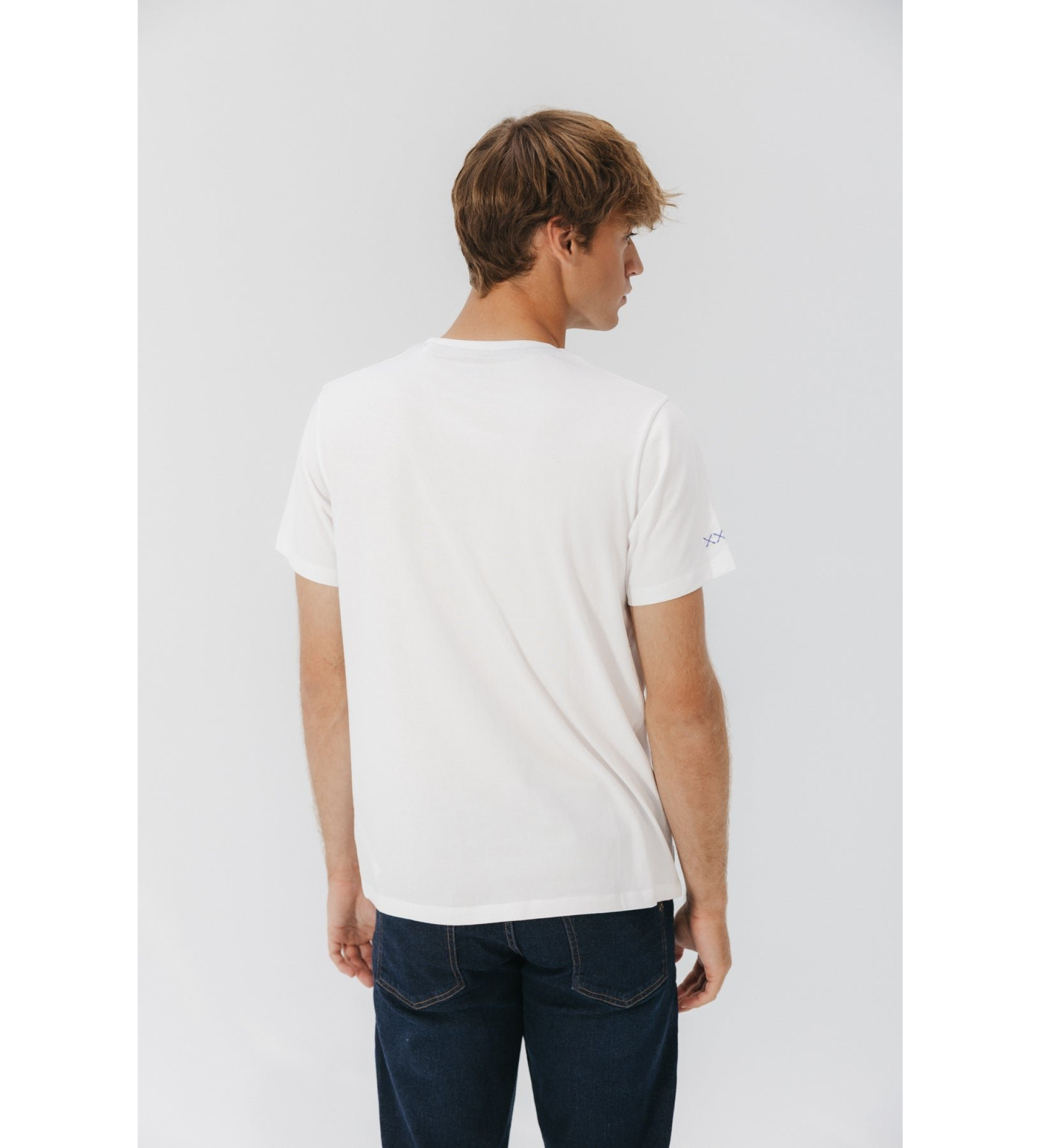 Camiseta de manga corta en color blanco puro con print North Pole Outfit en el pecho y detalles bordados en las mangas. Un diseño casual y moderno, ideal para el día a día.