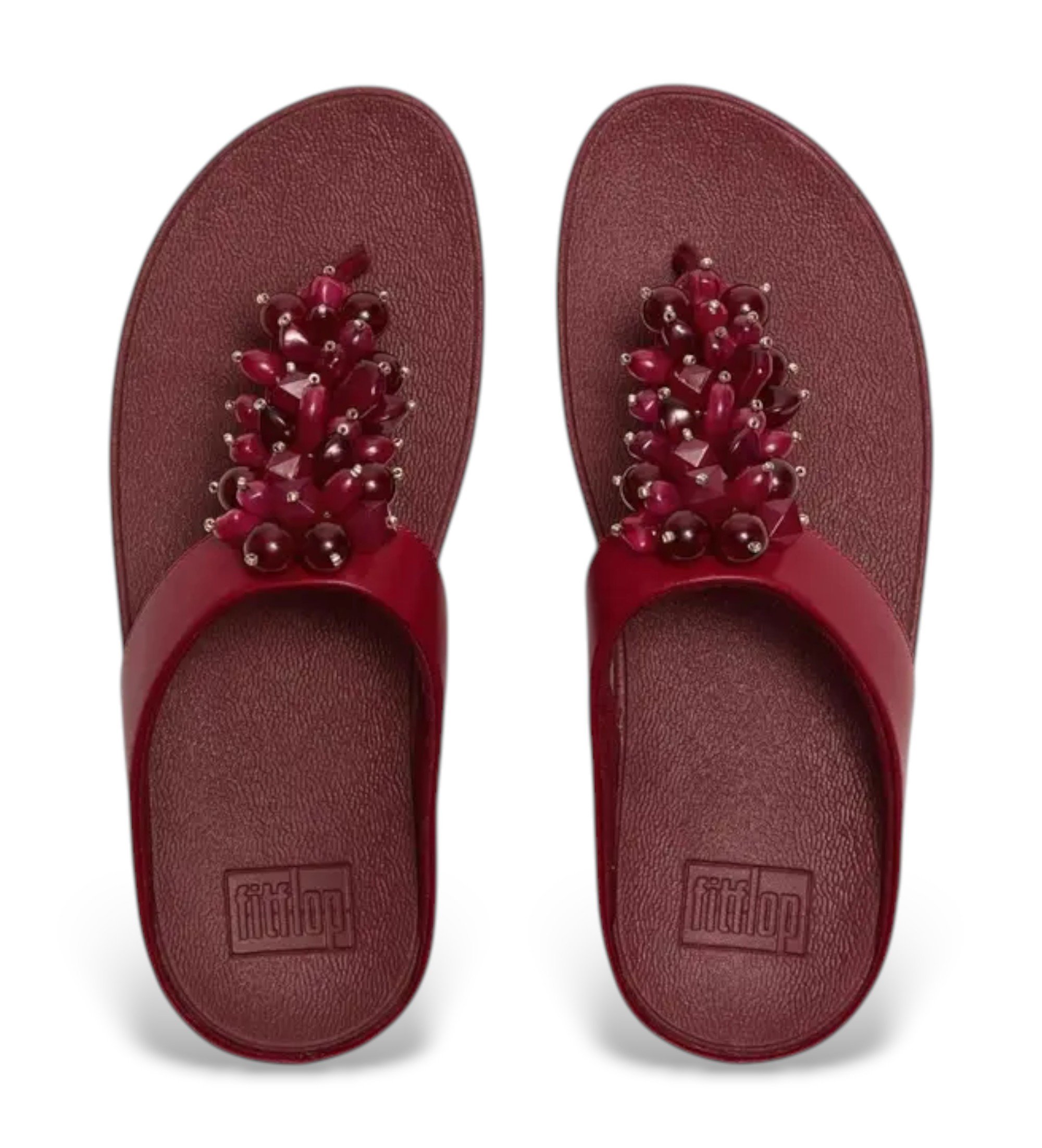 Sandalia de dedo FitFlop Fino Bead Cluster en granate, con tira fina que luce un elaborado conjunto de cuentas decorativas que capturan la luz con cada movimiento. Un diseño que combina la delicadeza joyera con la tecnología de confort característica de la marca, ideal para la mujer que no quiere renunciar a ninguna de las dos.