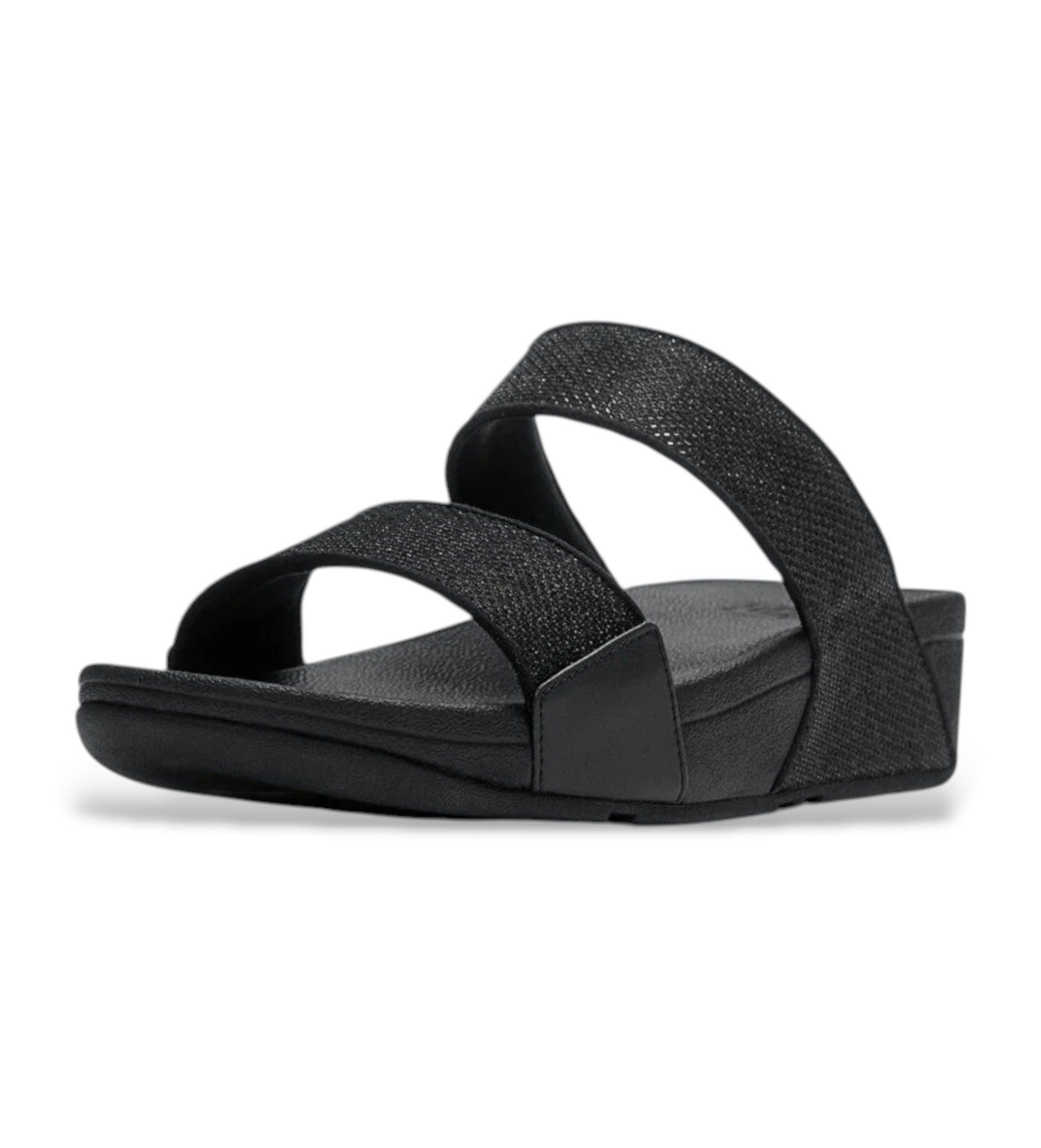 Sandalia de mule en negro total con dos tiras anchas de tejido con textura en relieve, sobre la característica plataforma ergonómica FitFlop. Un diseño minimalista y sofisticado que combina la estética urbana con el confort de uso prolongado.