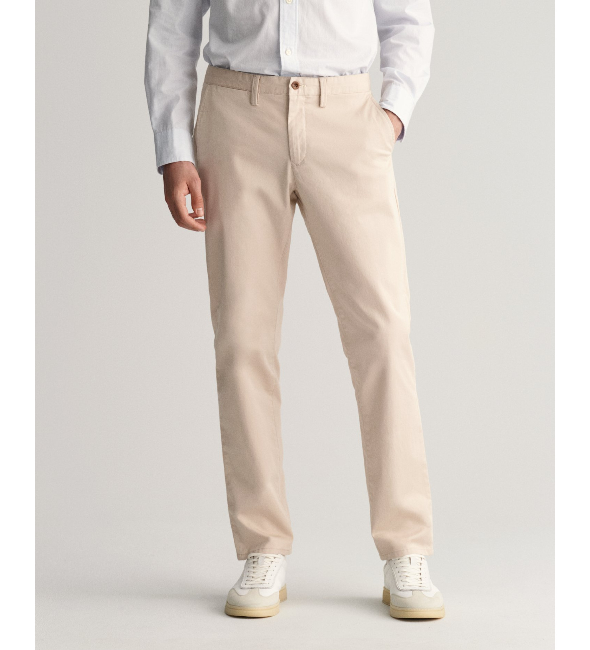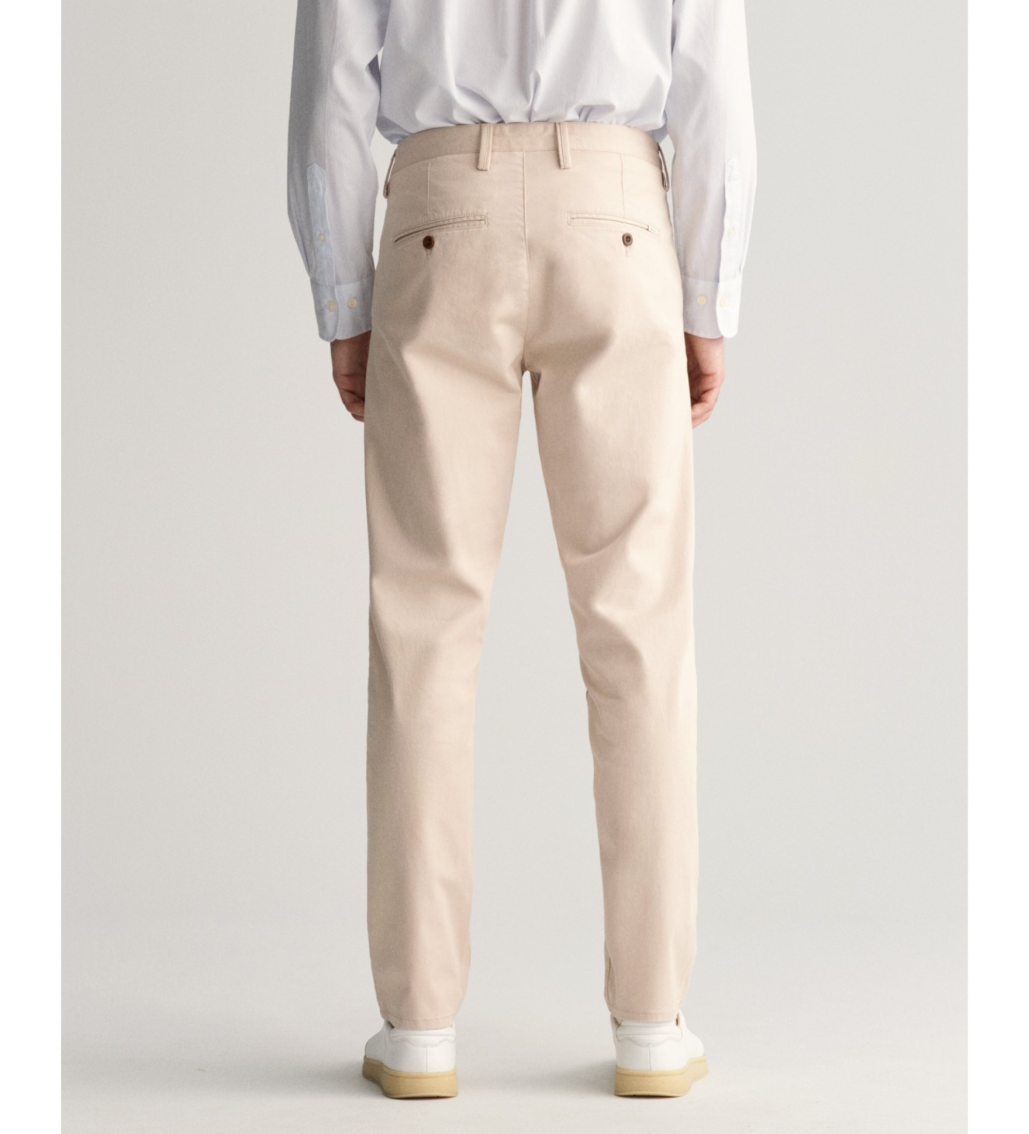Chinos de sarga de corte entallado para hombre de GANT están confeccionados con algodón orgánico con un toque elástico. Tiene un corte entallado en las caderas que continúa hasta la pierna. Con bolsillos traseros abotonados, el derecho con el logo de GANT, se puede combinar tanto con una camiseta casual como con una elegante camisa con botones.