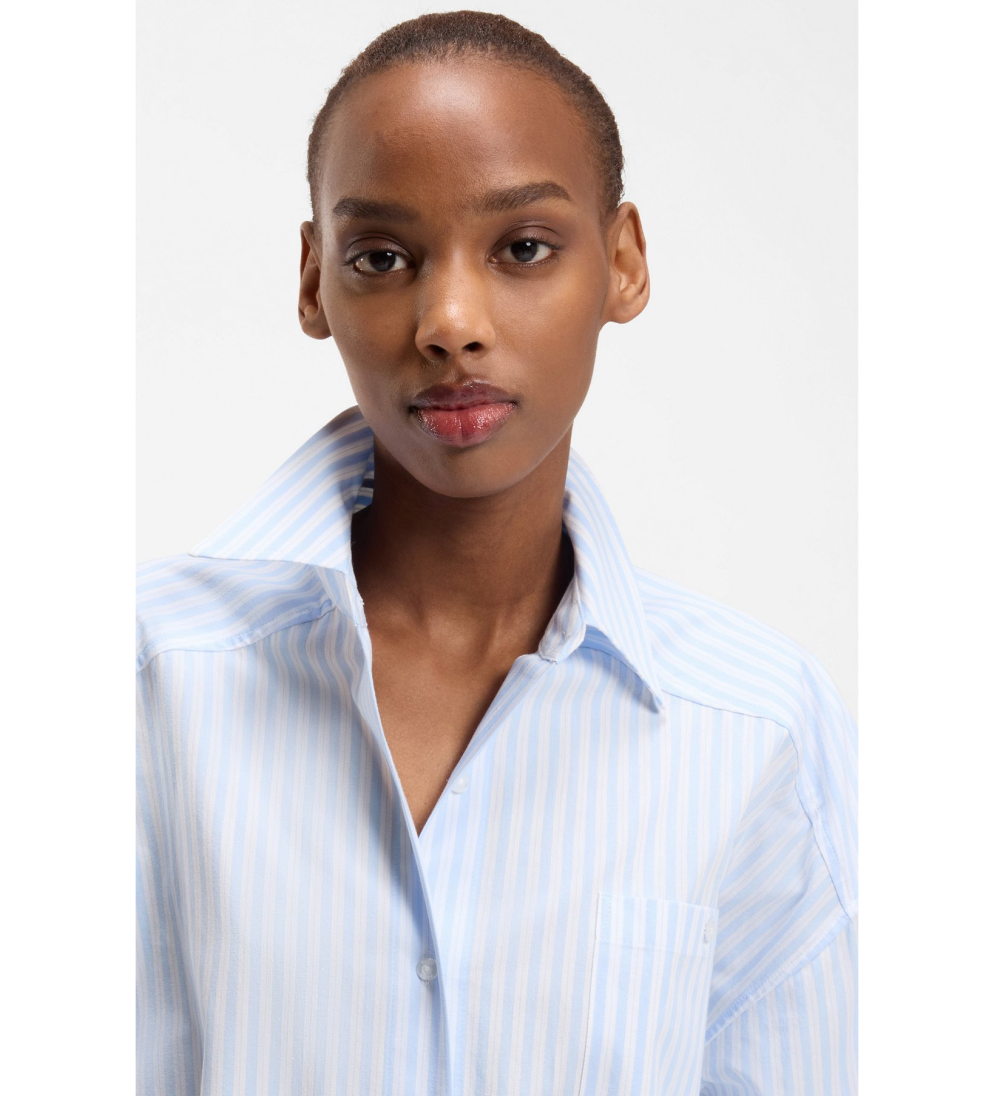 Esta blusa HUGO Mujer oversize fit se ha confeccionado en popelín de algodón a rayas para lucir un estilo clásico. Logo apilado metálico en la nuca. Bolsillo en el pecho.