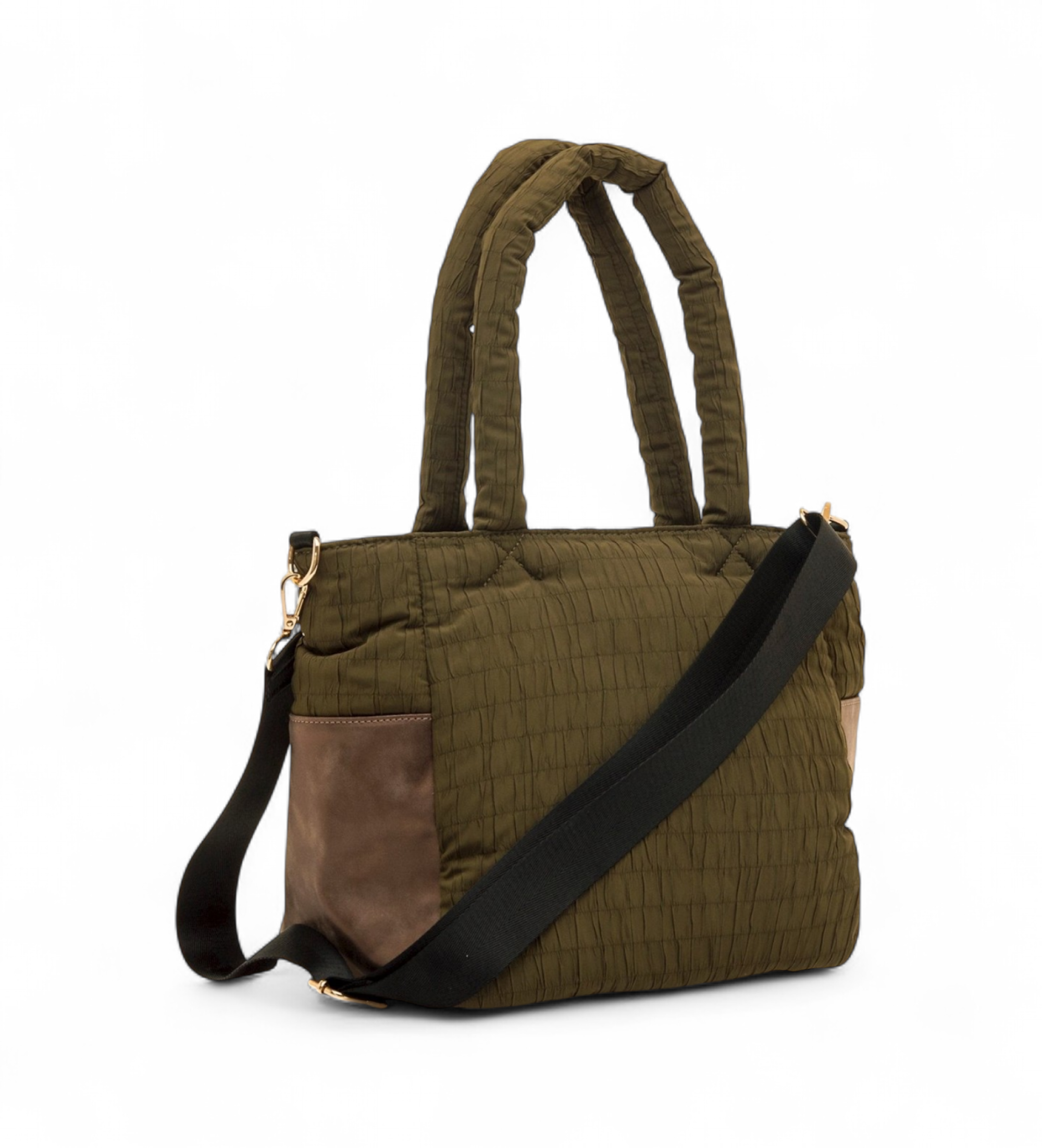Bolso shopper de mujer de Mariamare, modelo Pepi de color verde kaki. Su diseño acolchado y ligero lo convierte en una opción cómoda para el uso diario, con doble asa de mano y correa ajustable para llevar al hombro. Incluye bolsillo frontal con cremallera y tirador estampado de leopardo, ideal para organizar lo esencial de forma práctica. El detalle del logo metálico frontal y los laterales en tono metalizado aportan un toque moderno, perfecto para combinar con looks informales o urbanos.